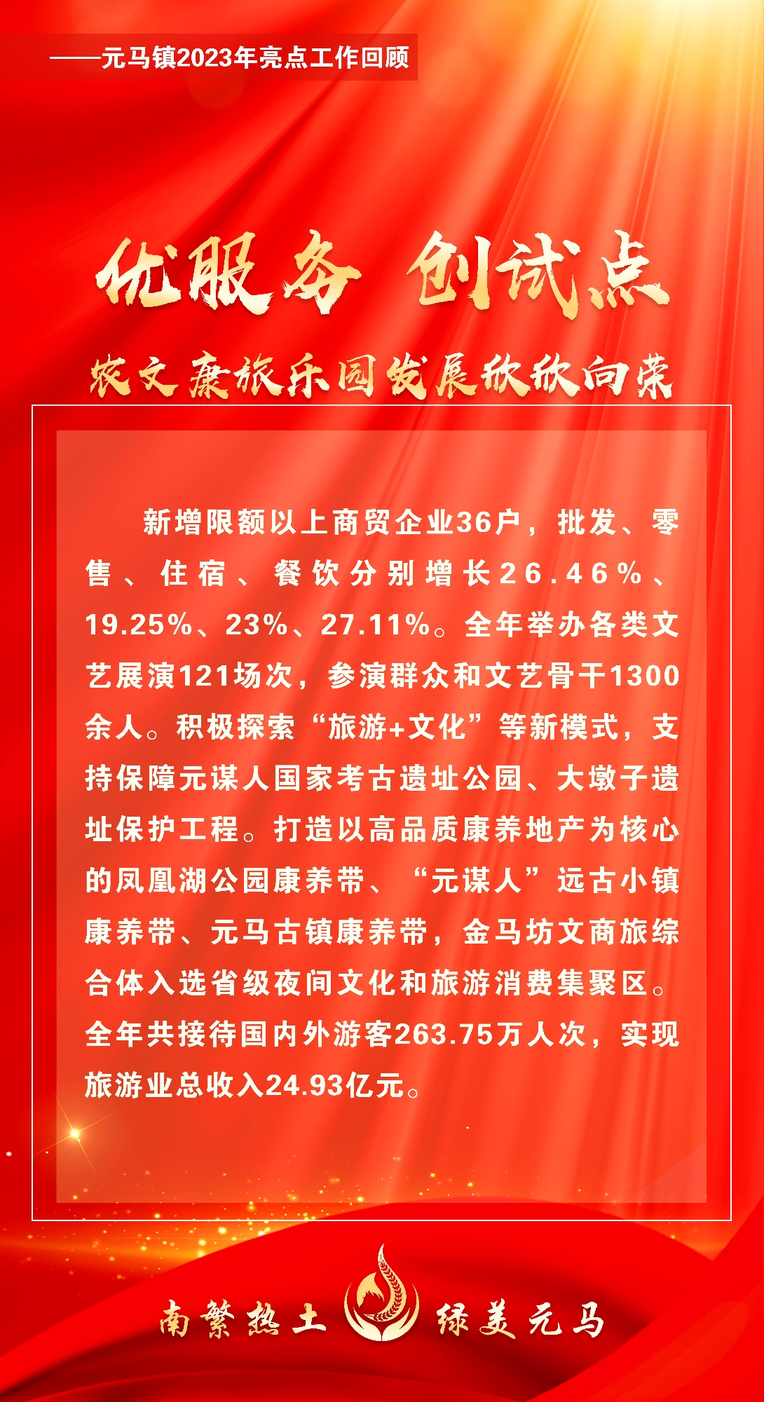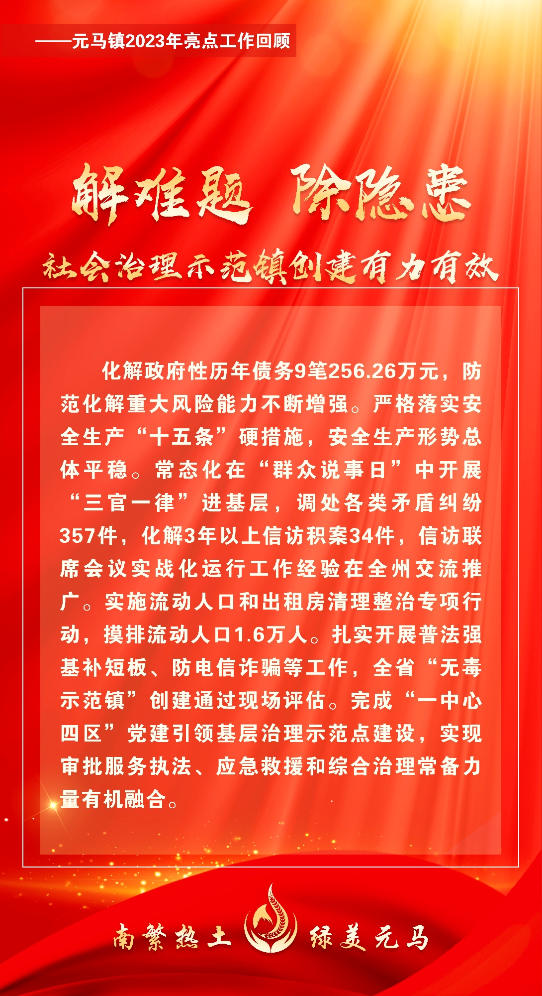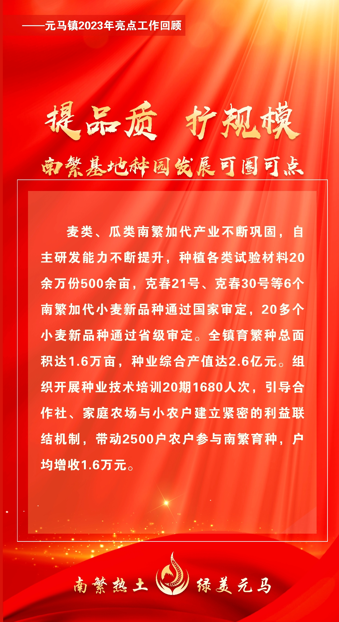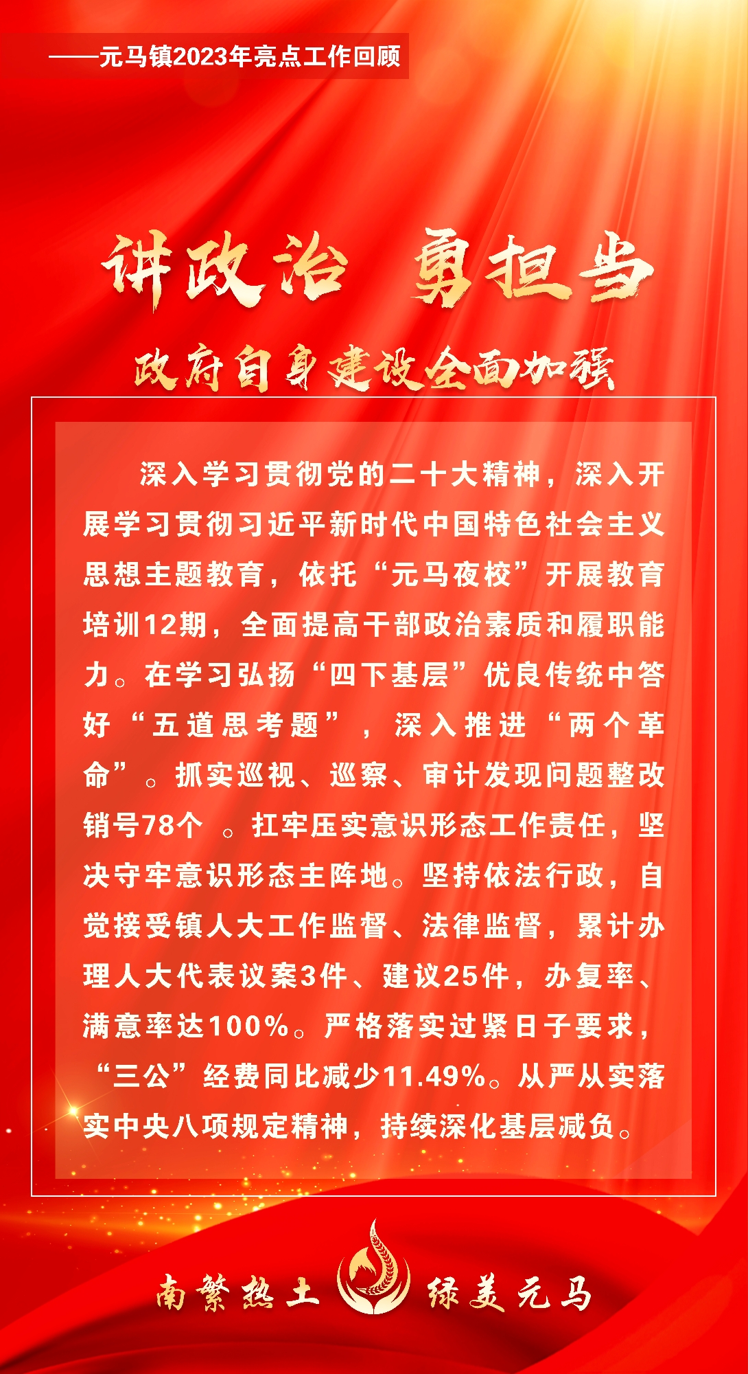 新的一年,元马镇将持续以习近平新时代中国特色社会主义思想为指导,深学笃用党的二十大精神,聚焦落实省委“3815”战略发展目标、州委推动高质量发展系列部署,以及全县打造“五个强县”擦亮“四张名片”发展目标,围绕全镇“一中心两镇四园”经济社会发展思路,从“六个着力”发力,通过经济发展、培强产业、谋划项目、推进乡村振兴、改善民生、守牢安全底线,全面加强政府自身建设,躬耕实干、奋发有为,全力推进全镇经济社会高质量发展,打响“南繁热土、绿美元马”外宣品牌。