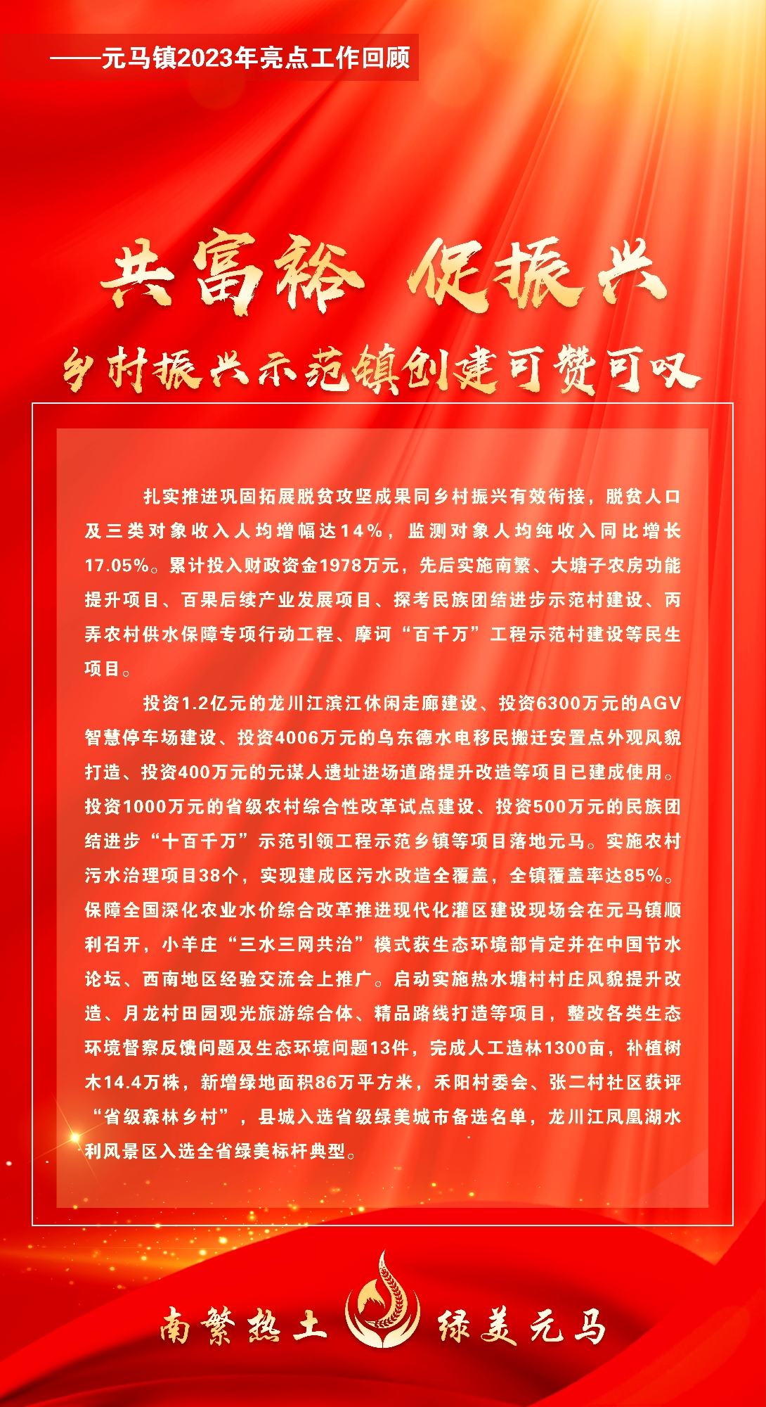 2023年,元马镇坚持以习近平新时代中国特色社会主义思想为指导,全面贯彻落实党的二十大精神,紧紧围绕“一中心两镇四园”经济社会发展思路,全面贯彻落实新发展理念、主动融入新发展格局。