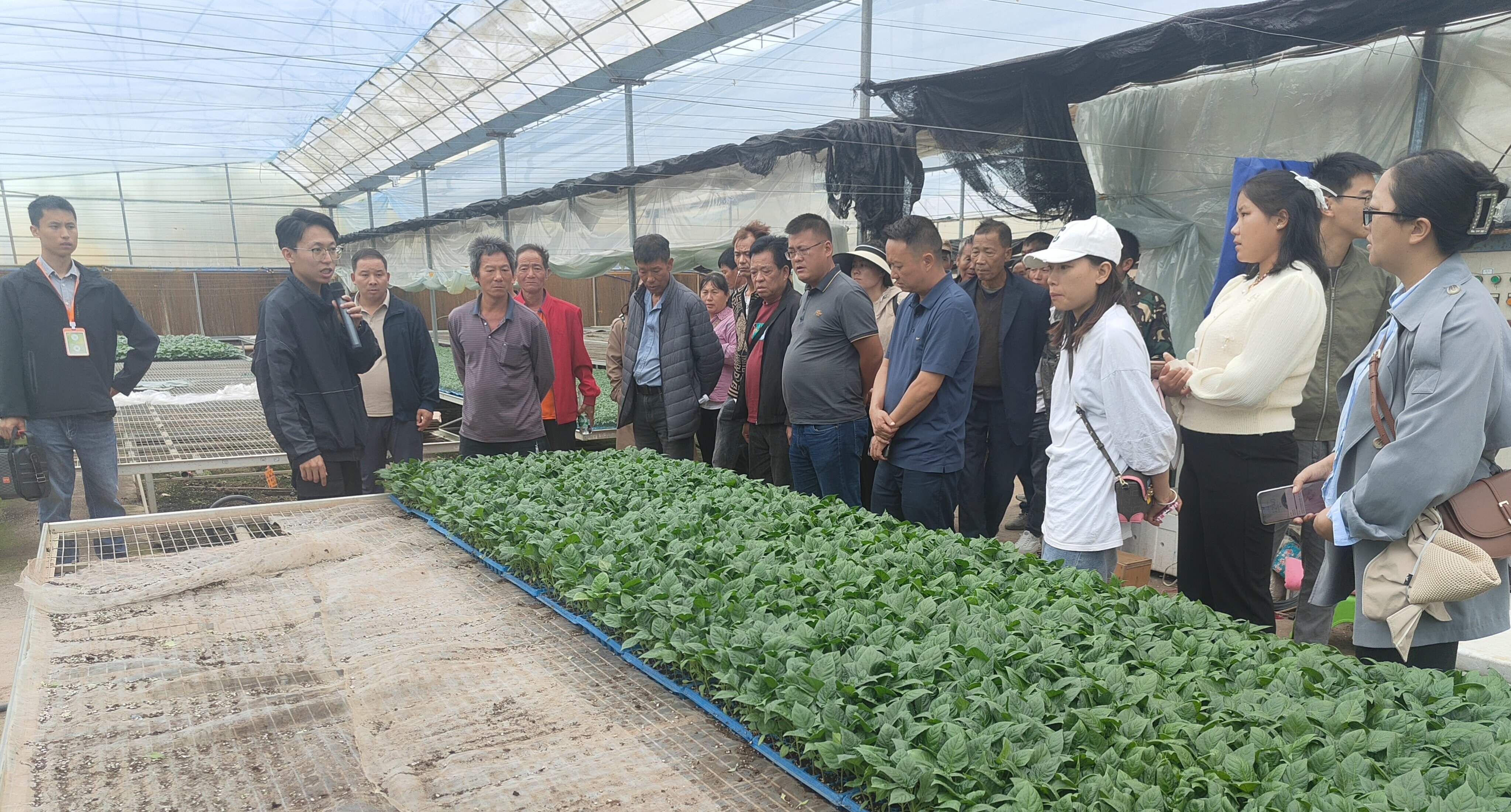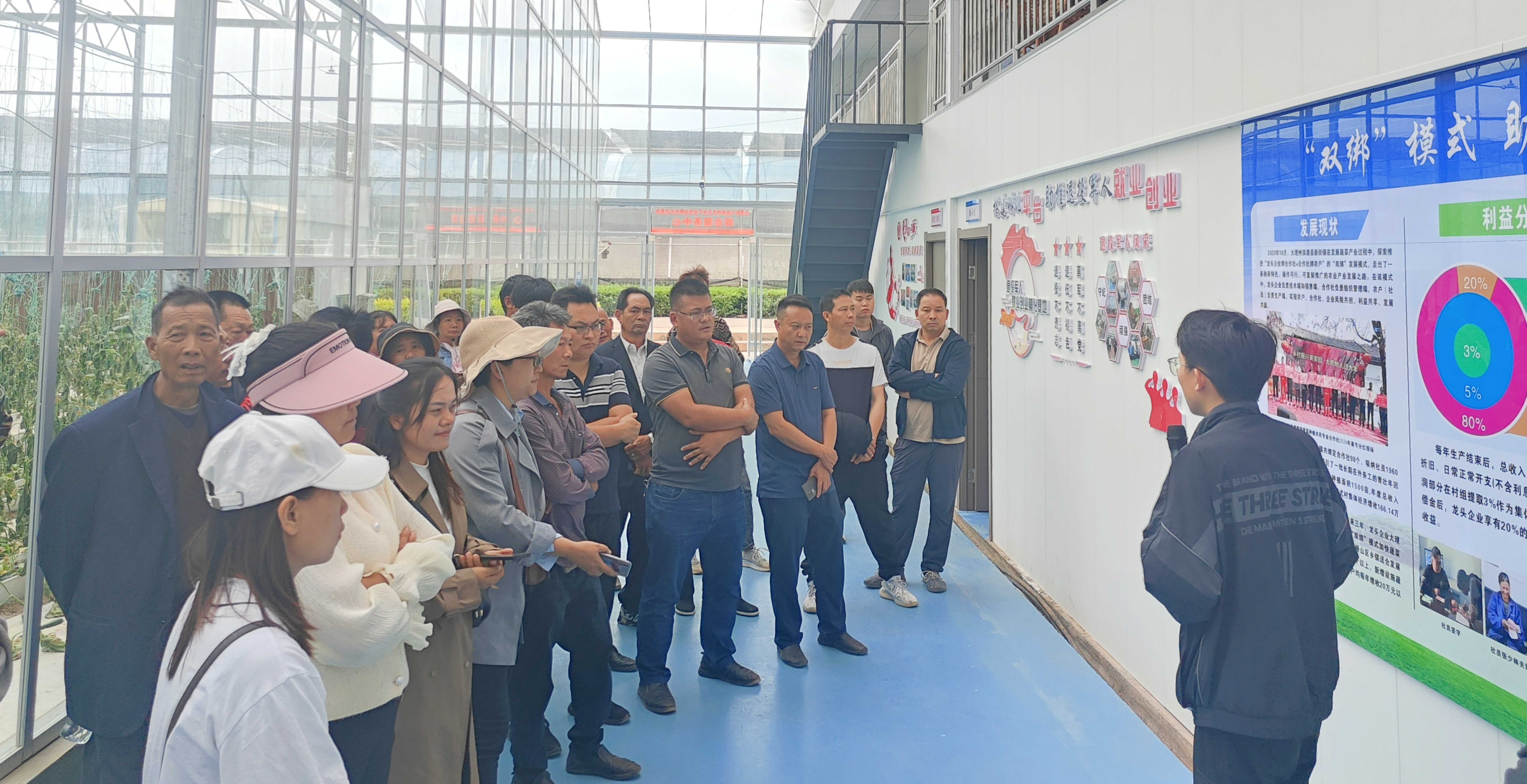 考察组先后参观了大理耘飞高原特色农业产业创业孵化示范基地、弥渡博润蔬菜种植农民专业合作社黄瓜种植基地等产业项目,认真听取了现场讲解员的讲解,并通过实地参观、观看培训短片、座谈交流等方式就设施蔬菜种植技术、“双绑双带”发展模式等方面进行了深入了解和学习。“双绑双带”发展模式是2020年10月,大理弥渡县新街镇在发展蔬菜产业过程中,探索推进的“龙头企业绑合作社+合作社绑农户”的产业发展模式,该模式中,龙头企业负责技术端和销售端,合作社负责组织管理端,农户(社员)负责生产端,实现农户、合作社、企业风险共担、利益共享、发展共赢,实现蔬菜产业标准化、科技化、规模化、高质量发展,带动村集体和农户双增收。截至2023年底弥渡县共绑定合作社98个,吸纳社员1960户,户均增收15万元以上。