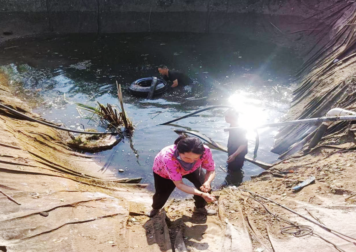在星火社区相树村二队,看到20余名党员、村民代表正热火朝天地挖土清淤、架设管道。相树二队支部书记杨加聪介绍道“我们村洗菜塘原有2口机井,主要用于村内土地灌溉,但由于持续干旱早已枯竭,造成村内100多亩土地无灌溉用水,粮食作物受灾。面对这种情况,我们组织召开群众会议,决定架设2500米管道从村子南面自留地基地坝塘引水到村子中间,用于保障春耕用水。”