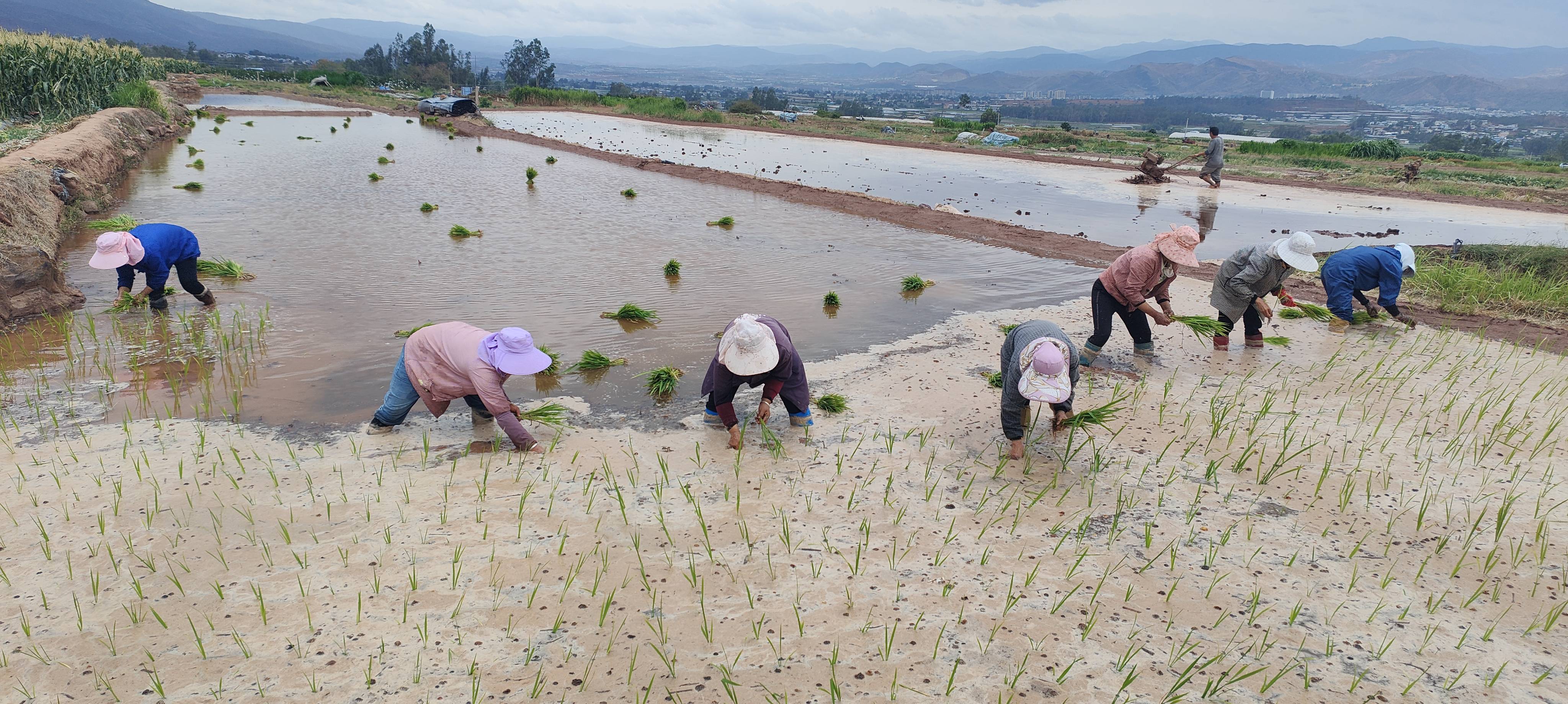 在育秧田里,一簇簇翠绿的秧苗正被拔起,大家把拔好的秧苗一把把捆绑起来,用背篓运送到田里,捆绑好的秧苗被零散地抛分在水田中,负责插秧的大姐们一手拿着秧苗进行分拨,一手快速地将秧苗插入田中,在大家的闲聊和欢笑声中,不一会儿水田中就插满了秧苗。