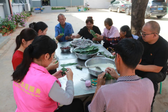 活动现场热闹非凡,志愿者们早早的把粽叶、糯米、棉线、蜜枣等包粽子所需的食材准备好,大家围在一起热情地忙碌着,折叠粽叶、投放糯米、添加馅料、一圈一绕捆绑着粽子,不一会儿一个个小巧玲珑的粽子逐渐成型,有尖脚的、有枕头的......现场到处萦绕着欢声笑语、飘溢着诱人的香气。随后,大家准备了爱心午餐,带着粽子、包子,前往孤寡老人、留守儿童家中,为他们送去了节日的温暖与祝福。“现在这个政策太好了,党和国家对我们老年人关心到位了,我们在一起包粽子,大家关系也拉近了,我们也感受到温暖和关怀。”老人李翠芹高兴地说。“这是我第一次包粽子,听说包粽子一定要压实捆紧,煮出来的味道才香。我们基层的工作就像包粽子一样,只有大家紧紧地凝聚在一起,团结在一起,才能把基层的工作做得好,群众才会更加幸福”。青年团员施学薇说。“端午节是我国的传统节日,我们主要就是通过这个活动让“一老一小”感受到来自社会大家庭的温暖。今后,我们将持续加大做好关爱‘一老一小’工作,为建设和谐社会作出应有的贡献。”新昌村委会党总支书记杨怀东说。