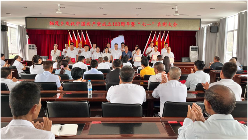 为庆祝中国共产党成立103周年,重温党的光辉历程,激励广大党员干部坚定理想信念,厚植爱党爱国情怀,元谋县物茂乡党委召开全乡庆祝中国共产党成立103周年暨“七一”表彰大会,回顾建党103年来的关辉历程,命名表彰一年来全乡涌现出的先进基层党组织、优秀共产党员和优秀党务工作者,激励全乡各级党组织和广大党员干部发扬传统,不忘初心、砥砺前行,推动全乡经济社会更好更快发展。
