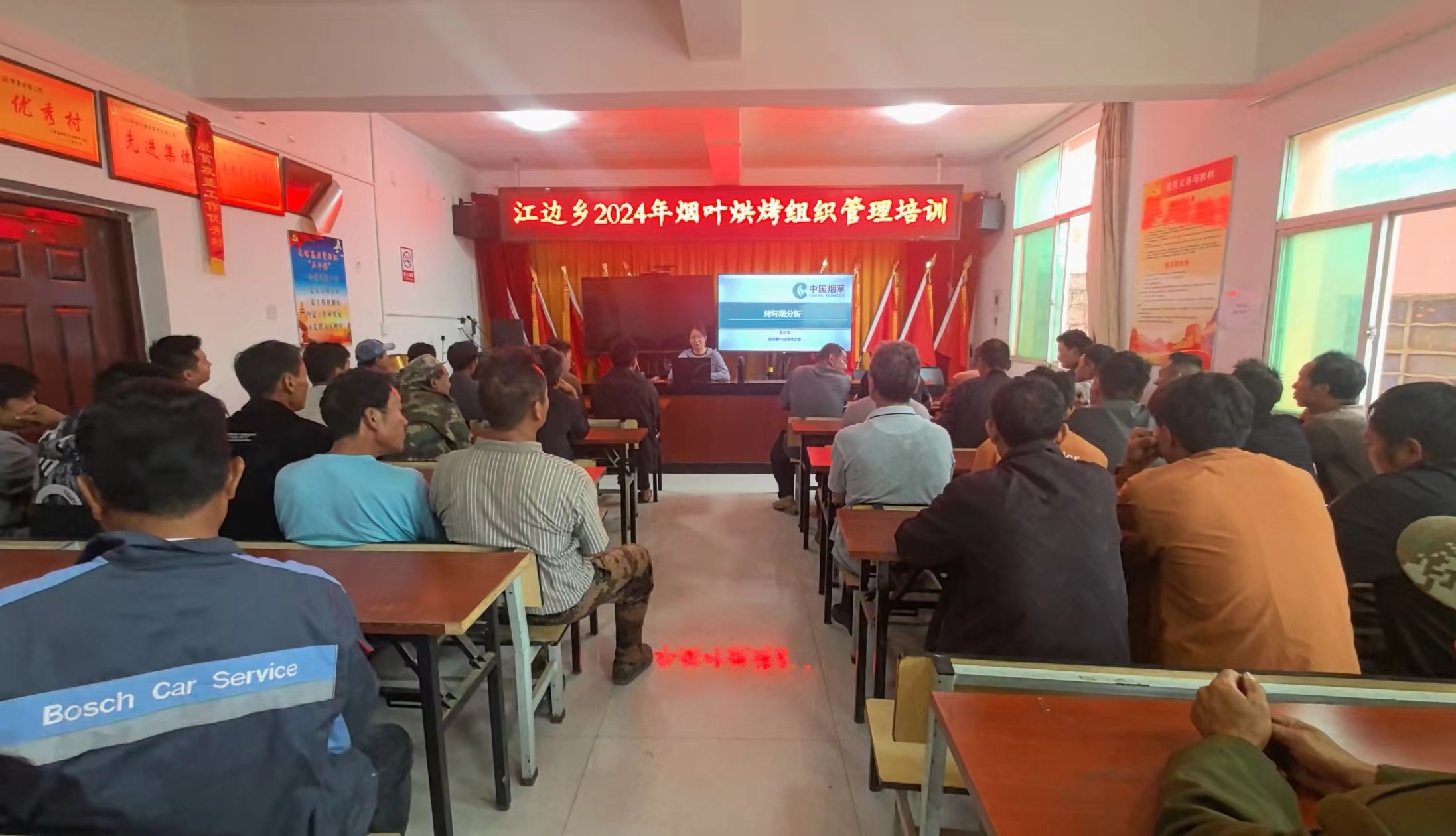 2024年7月25日,江边乡组织烟农到卡莫村委会开展烟叶烘烤组织管理培训。