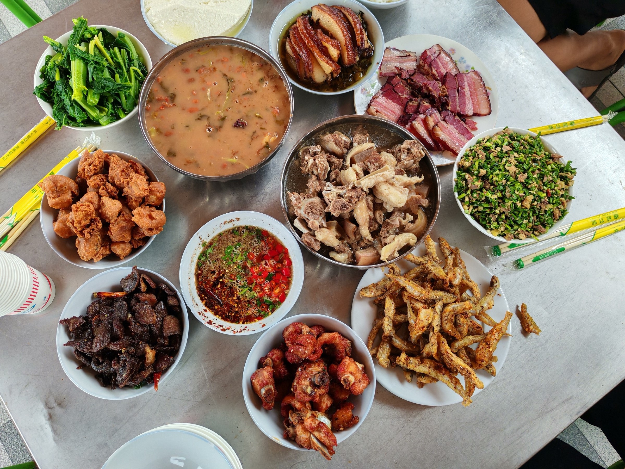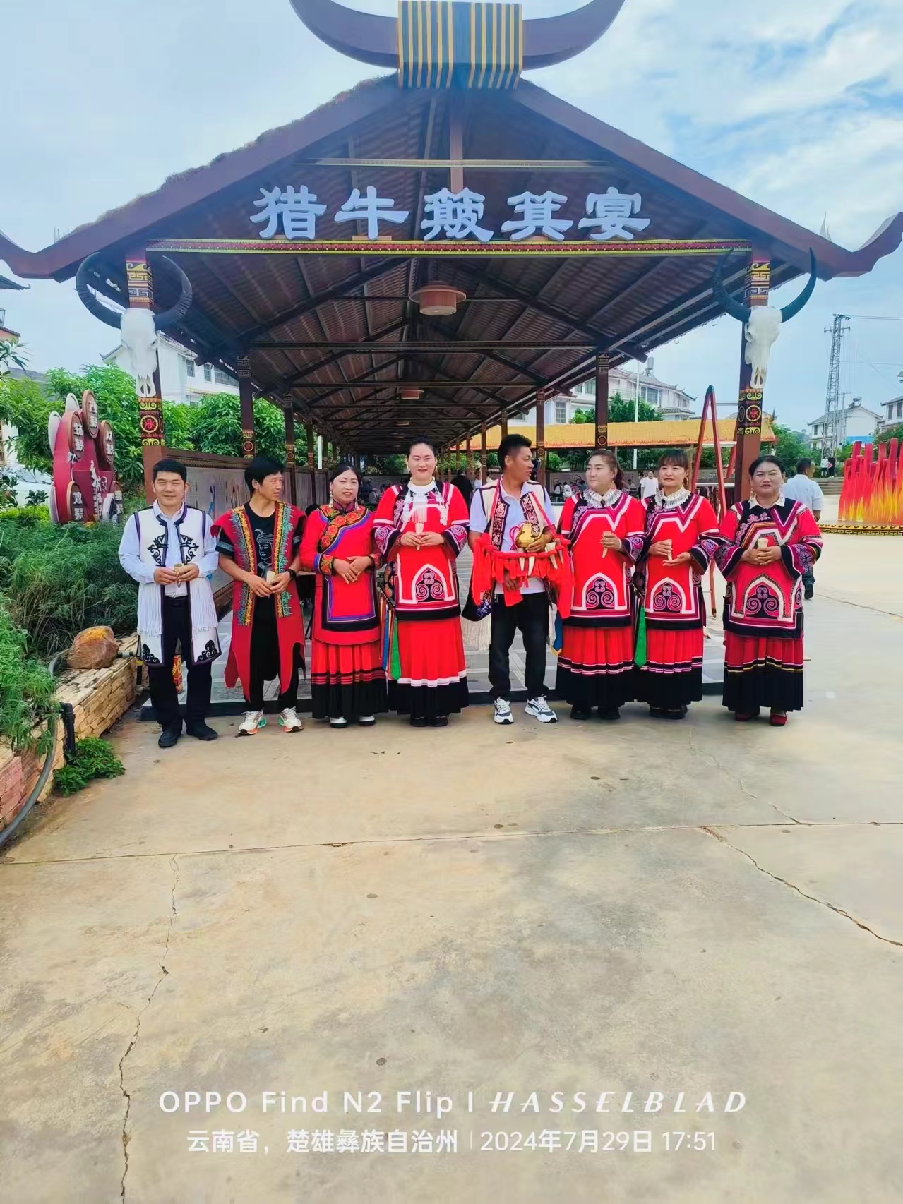 在野味十足的猎牛长街宴上,彝家儿女身着盛装,唱着歌谣,欢迎前来参加宴席的宾客们,向宾客们送上热忱的祝福,使来宾感受到强烈的彝家热情。在广场边廊道上,摆上长长的桌子,摆满各种彝族特色的食物,宾客们可以一边享受美食,一边欣赏文艺演出,感受彝族火把节的热情。