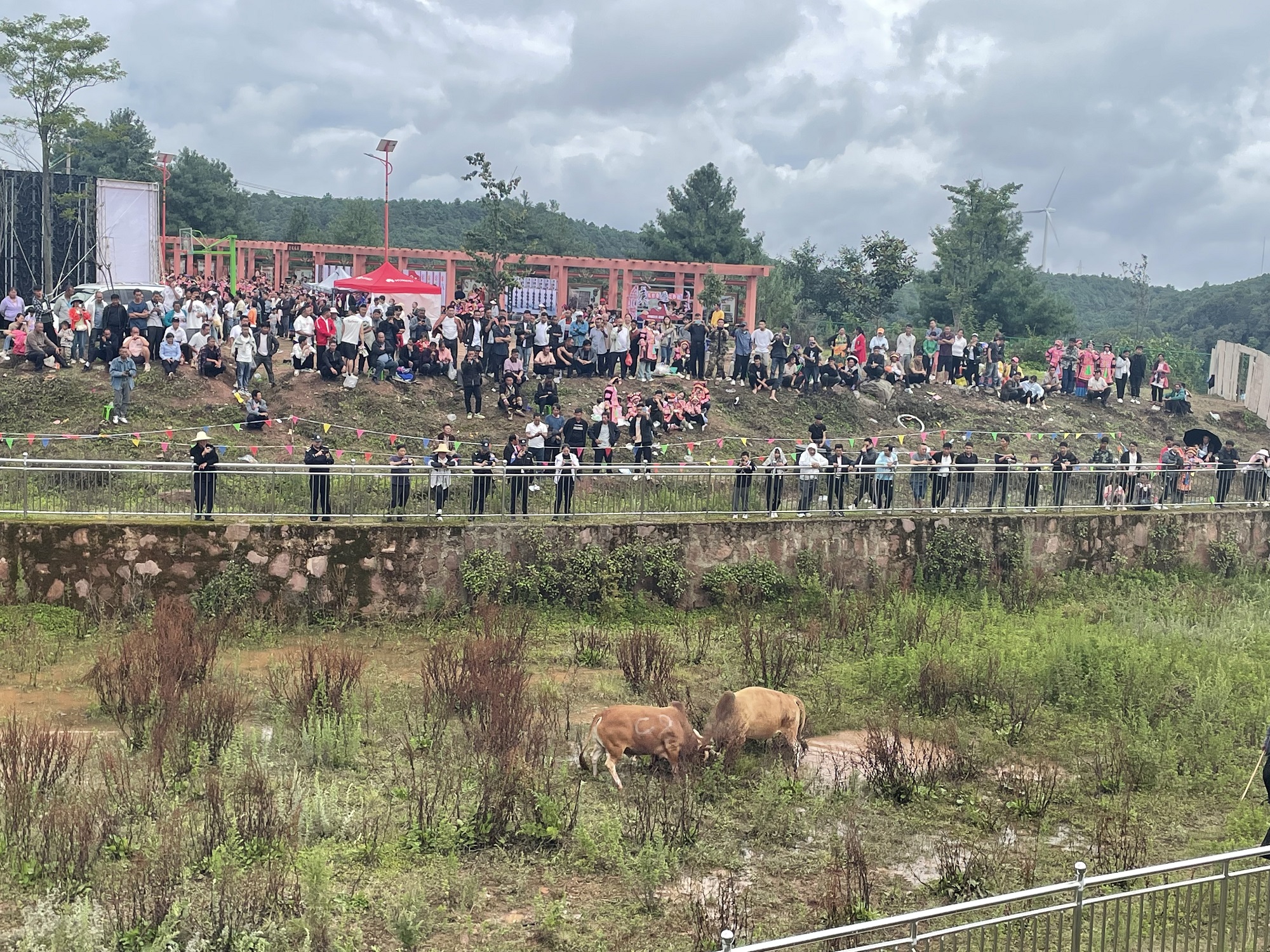 一时间,场内尘土飞扬,场外喝彩不断。两头赛牛你不让我,我不让你,使出自己的看家本领,头顶、角扎、扣眼、锁喉,上演着斗牛原始的野性。精彩无比的牛王争霸牵引着现场观众的心,大家时而高声喝彩,拿出手机录下精彩瞬间,时而叹气惋惜,惊险、奇特、壮烈的真实搏斗场面让广大游客直呼过瘾。