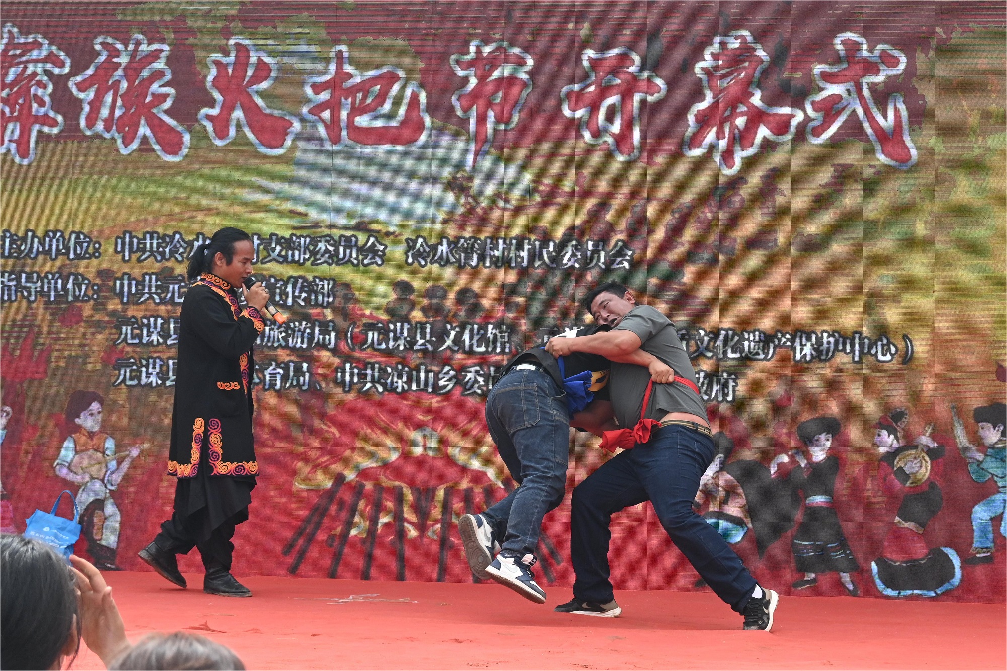 一方水土孕育一方特色,凉山乡冷水箐村委会火把彝村的火把节已传承了300多年的历史。每年火把节的摔跤现场,都会吸引众多彝族小伙、姑娘前来参加比赛,因为民族血脉中的冲劲,他们从“看比赛”“自己练”到成“摔跤王”,通过努力获得美誉,得到别人的称赞和尊敬,不少的“摔跤王”因此走出了小山乡,登上了更大的舞台。