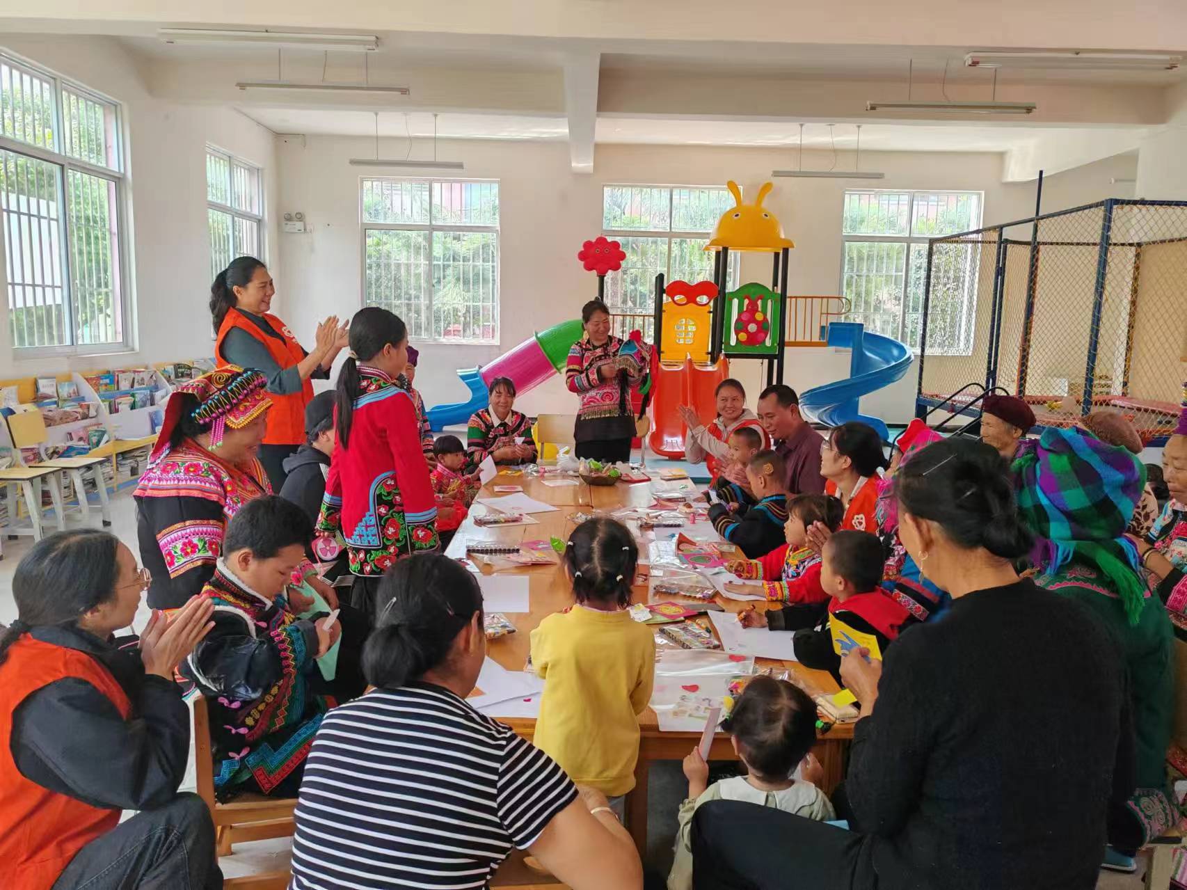 活动当天,凉山乡幼儿园热闹非凡,老人和孩子们带着对彝绣艺术的浓厚兴趣纷纷前来,志愿者们提前准备好了彝绣、剪纸、彩绘等道具,并邀请了凉山乡彝绣杨老师进行现场指导和教学。杨老师首先向大家介绍了非遗彝绣的历史渊源和文化内涵,让他们对彝绣文化有了更全面的了解,随后详细讲解彝绣中吉祥纹样的分类、寓意。紧接着杨老师还现场示范了彝绣技巧并邀请参与活动的老人和孩子围坐在一起,共同交流学习。