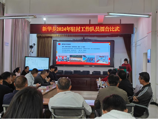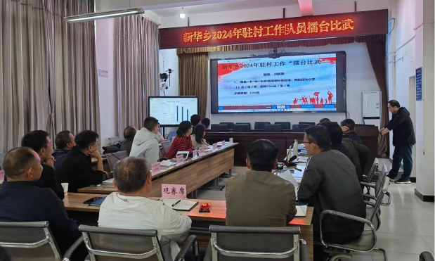 为进一步有效激发全体驻村队员干事创业热情和学习借鉴能力,推动驻村工作取得新进展新成效,2024年11月4日上午,新华乡组织全体驻村工作队开展“擂台比武”,乡党政班子成员作为评委,部分年轻干部列席观摩学习。