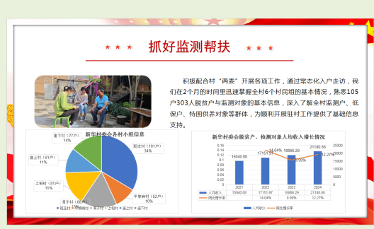 工作特色亮点展示环节,4支驻村工作队采取“PPT展示+演讲”的方式轮番上阵。参赛人员根据驻村期间所得,立足村情实际和自身工作,以图文并茂的方式展示和总结驻村帮扶以来的工作成效,评审人员按照评分标准进行现场打分。新华村驻村第一书记杨佳同志的工作报告《我们与新华的春夏秋冬》,以“春 撒播初心之种、夏 灌溉青春之苗、秋 收获成长之果、冬:蓄积坚韧之力”为脉络,向大家讲述了驻村故事和工作成效,生动的语言、详实的数据、鲜活的案例,得到现场观众热烈的掌声。