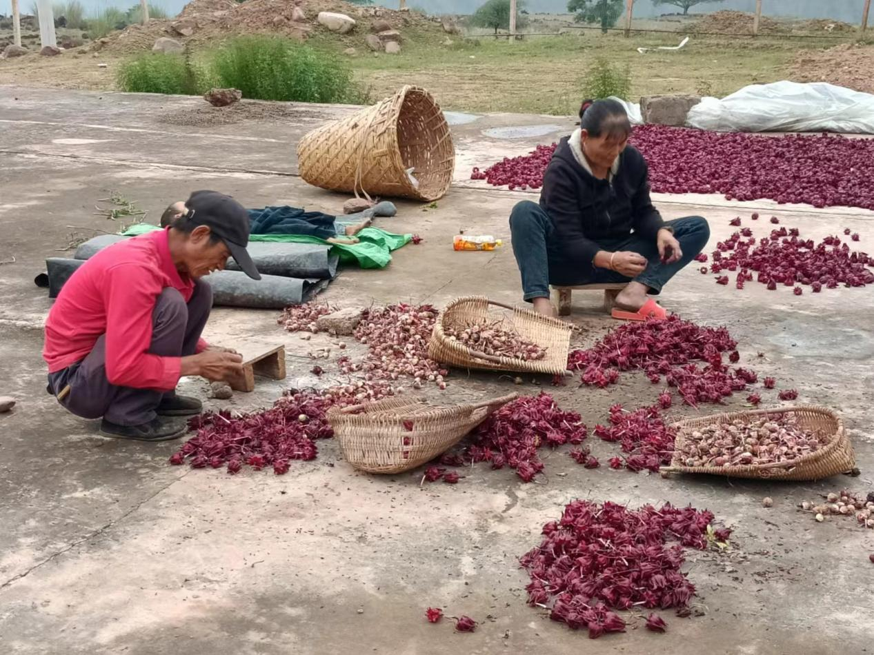 近日,江边乡金沙江两岸的洛神花开始采收,走进村子里,群众正忙着收割、采摘、去核、晾晒。