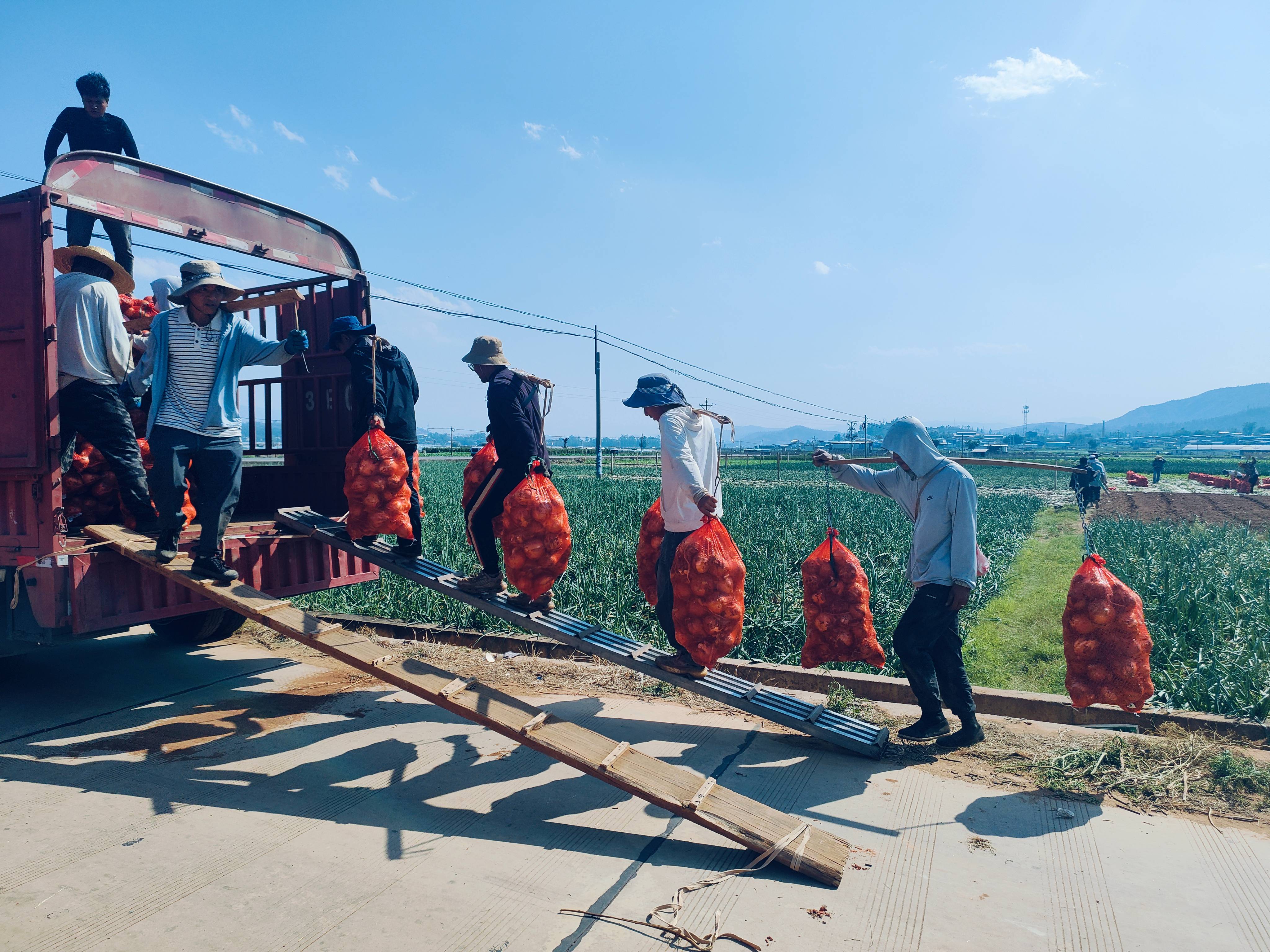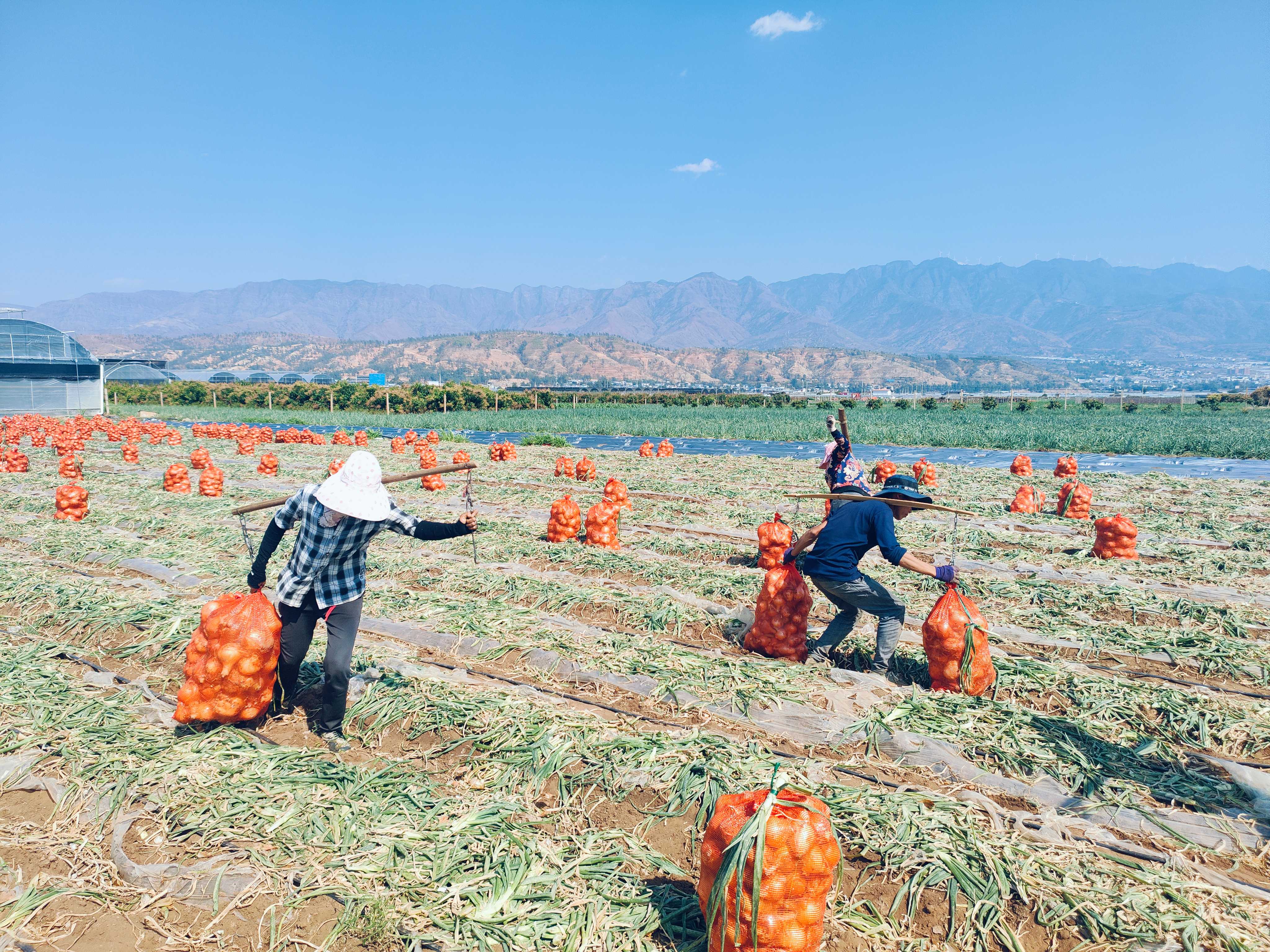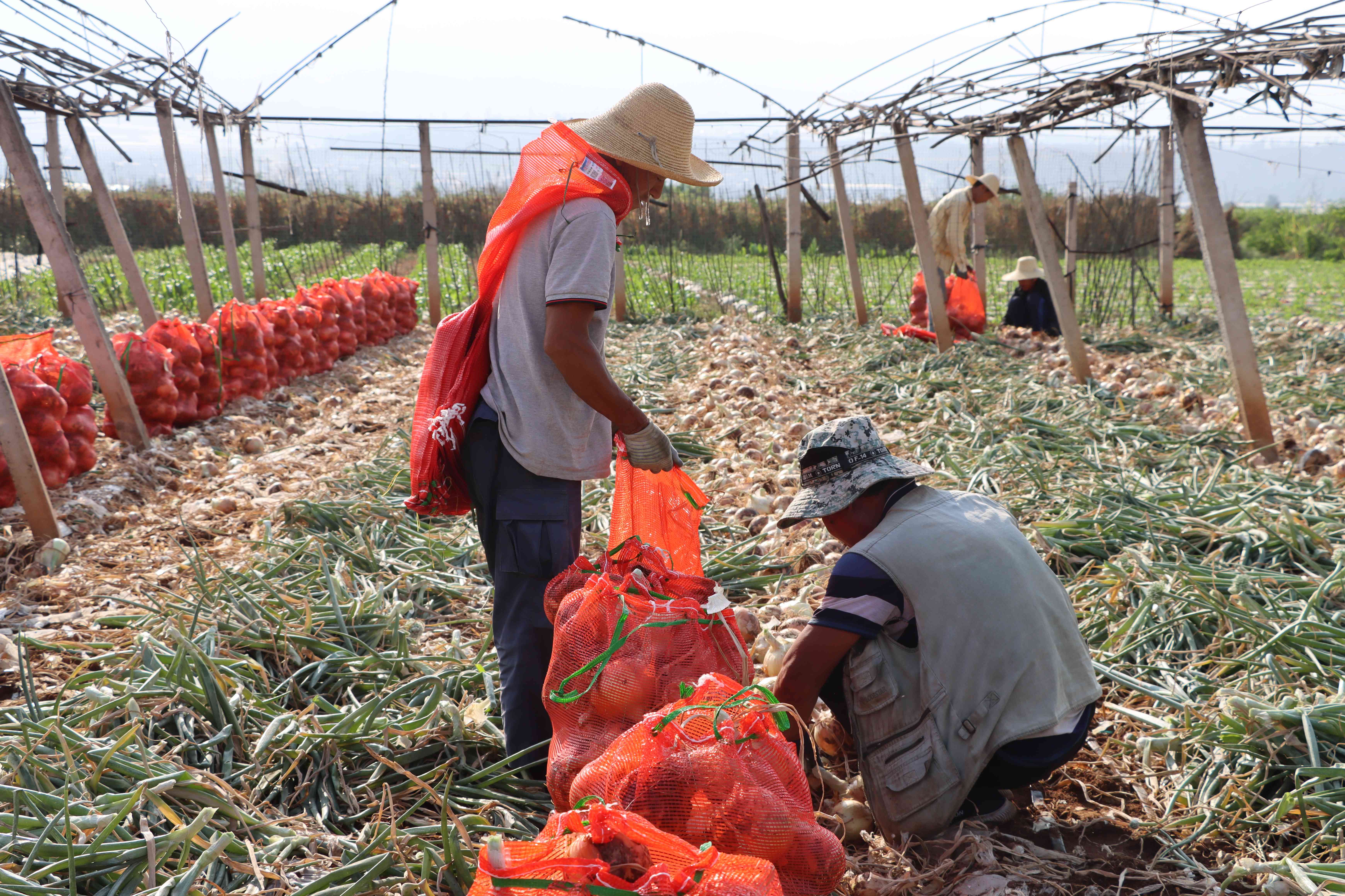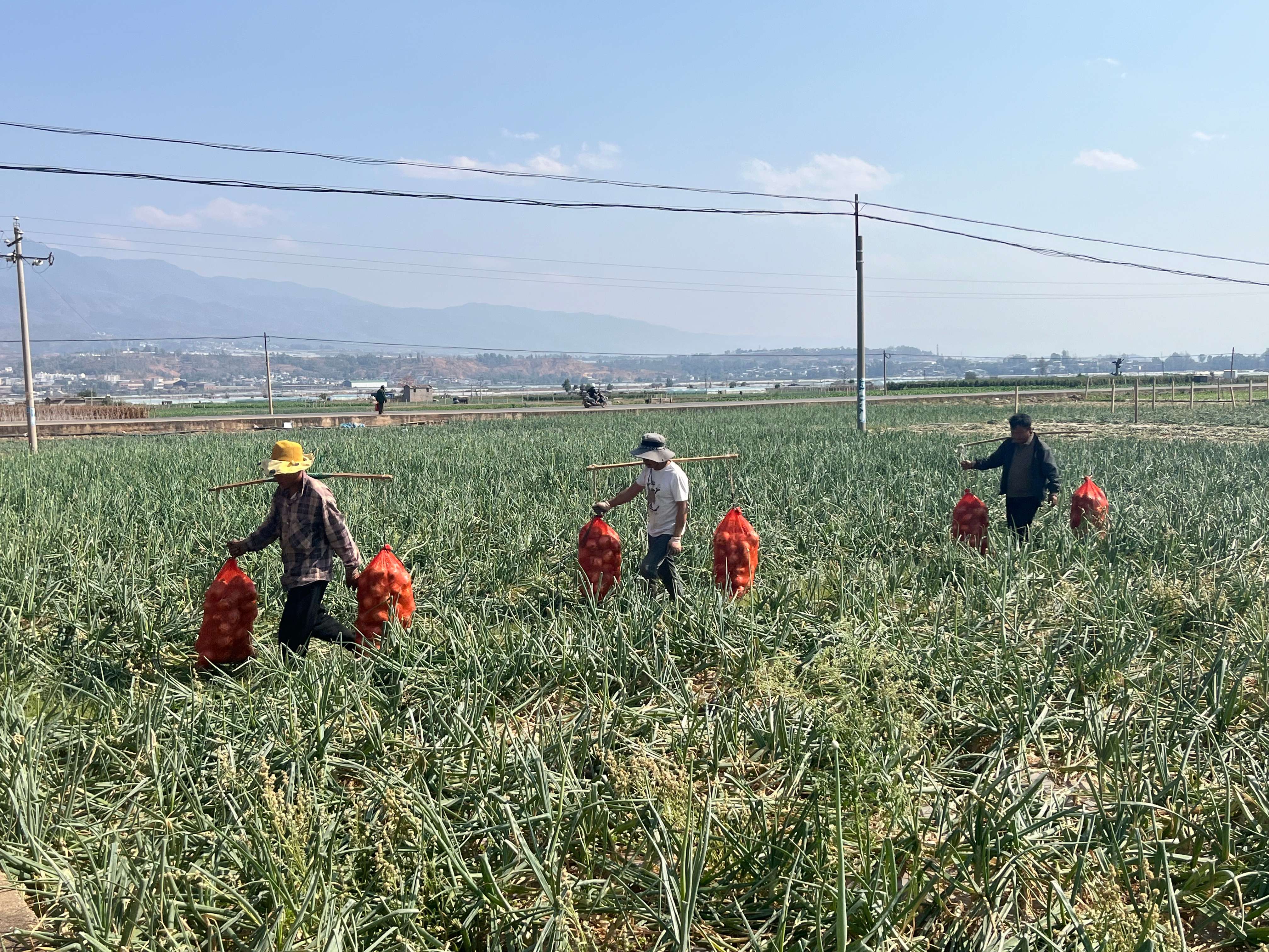 在苴林村委会苴林小村,工人们正在田坝里忙碌着。“我们村这边主要由农户负责种植,每年洋葱成熟,代收购商就会过来收购,他们根据洋葱的种类和品质,按每亩0.8-1.2万元的价格购买,购买后,代收购商就自行找工人进行挖葱,我们是计件结算每天报酬,按每袋4.5元来算,一天下来能有300元左右的收入。”正在装袋的工人杨国聪说道。