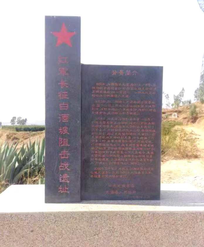 1935年5月,中央红军长征过元谋,为诱敌于元谋,掩护主力部队从禄劝皎平渡渡过金沙江,红一军团一、二两师从武定县的石腊兵分两路进入元谋。5月3日,二师殿后的六团三营留守白酒坡阻击尾追的滇军。红军依靠险要的地势,共打伤滇军10余人,打死4人,红军伤4人,牺牲2人,为大部队从皎平渡渡江入川争取了时间。白酒坡阻击战是红军长征过元谋、长征“巧渡金沙江”的重要组成部分和重要环节,红军长征过元谋是长征光辉史诗和中国共产党革命历史不可缺少的一页。瞻仰红色纪念碑,听红色故事,接受红色教育、缅怀革命先烈、追忆革命历史,珍惜今天幸福生活之来之不易。