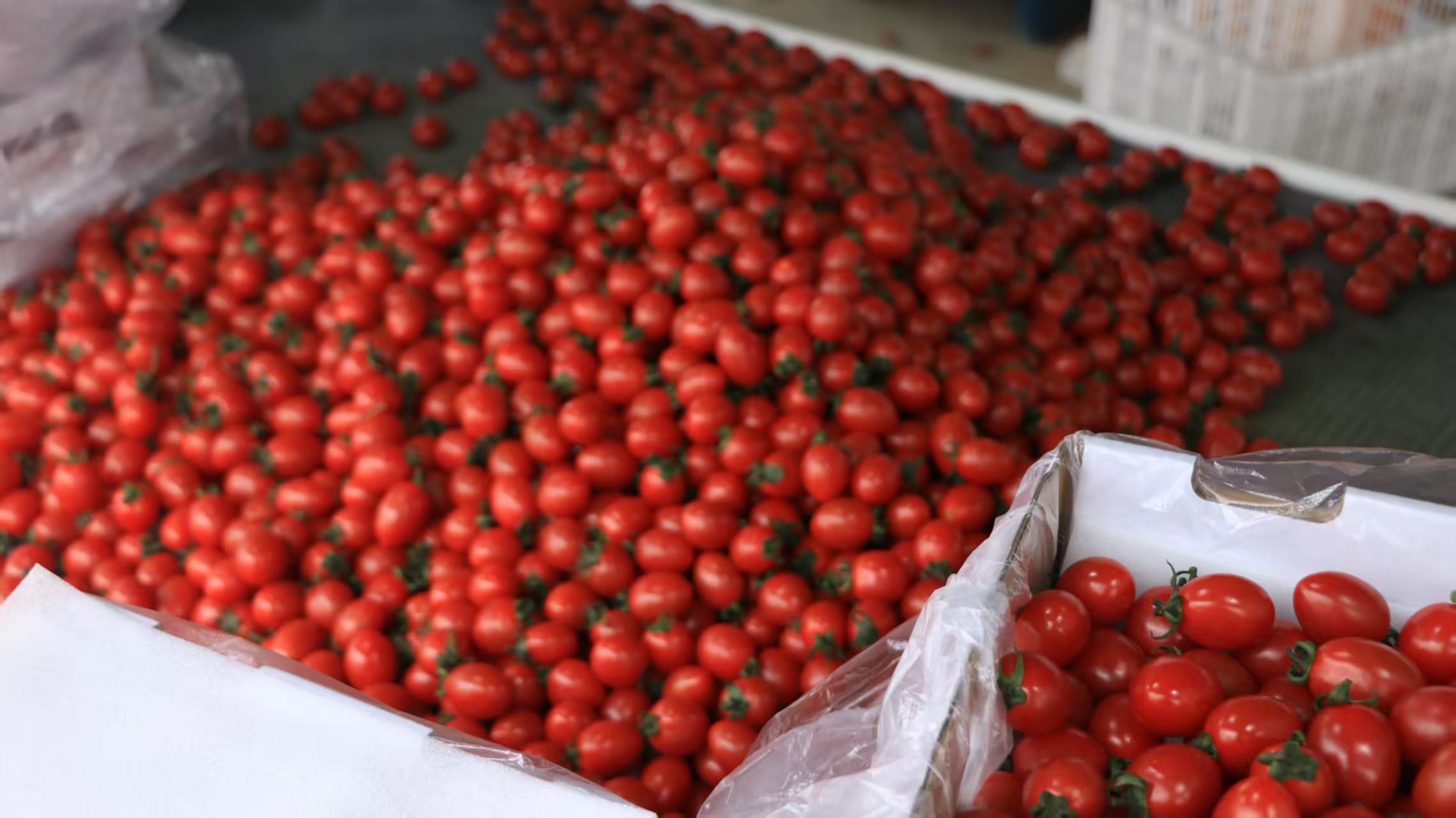 “姜驿乡土地资源丰厚,光照足、昼夜温差大,有利于糖分积累,得天独厚的气候条件滋养出来的番茄口感清甜、皮薄肉脆、营养丰富,我们到这里种植蔬菜已经3年了,目前基地面积已经有蔬菜种植大棚210个,种植种类覆盖番茄、黄瓜、西瓜等多个品种,主要销售到上海、广州等地。目前上市的小番茄单价稳定在10元/公斤,预计收入在360万元左右。基地负责人刘亚辉介绍道。