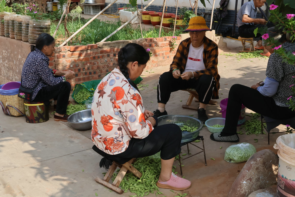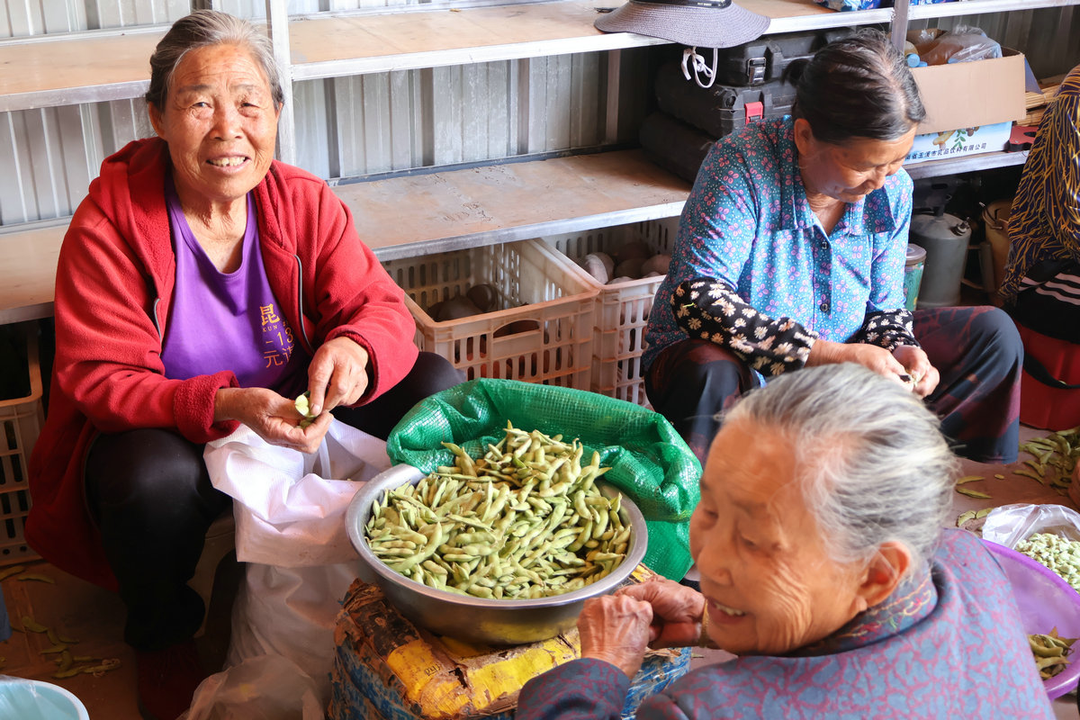清晨,元谋县元马镇金龙社区江头村“家门口的务工车间”内已是一派繁忙景象。鲁朝鲜大爷和老伴罗丙莲手指间不停地剥毛豆,一斤带皮豆子剥出来只有4两,夫妻合作一天能挣得60余元工费。这对“银发”夫妻的身旁,几十位老乡邻一边忙碌着,一边谈笑风生。500公斤新鲜毛豆经过分拣包装,将搭乘冷链车奔向省外连锁超市的生鲜柜台。