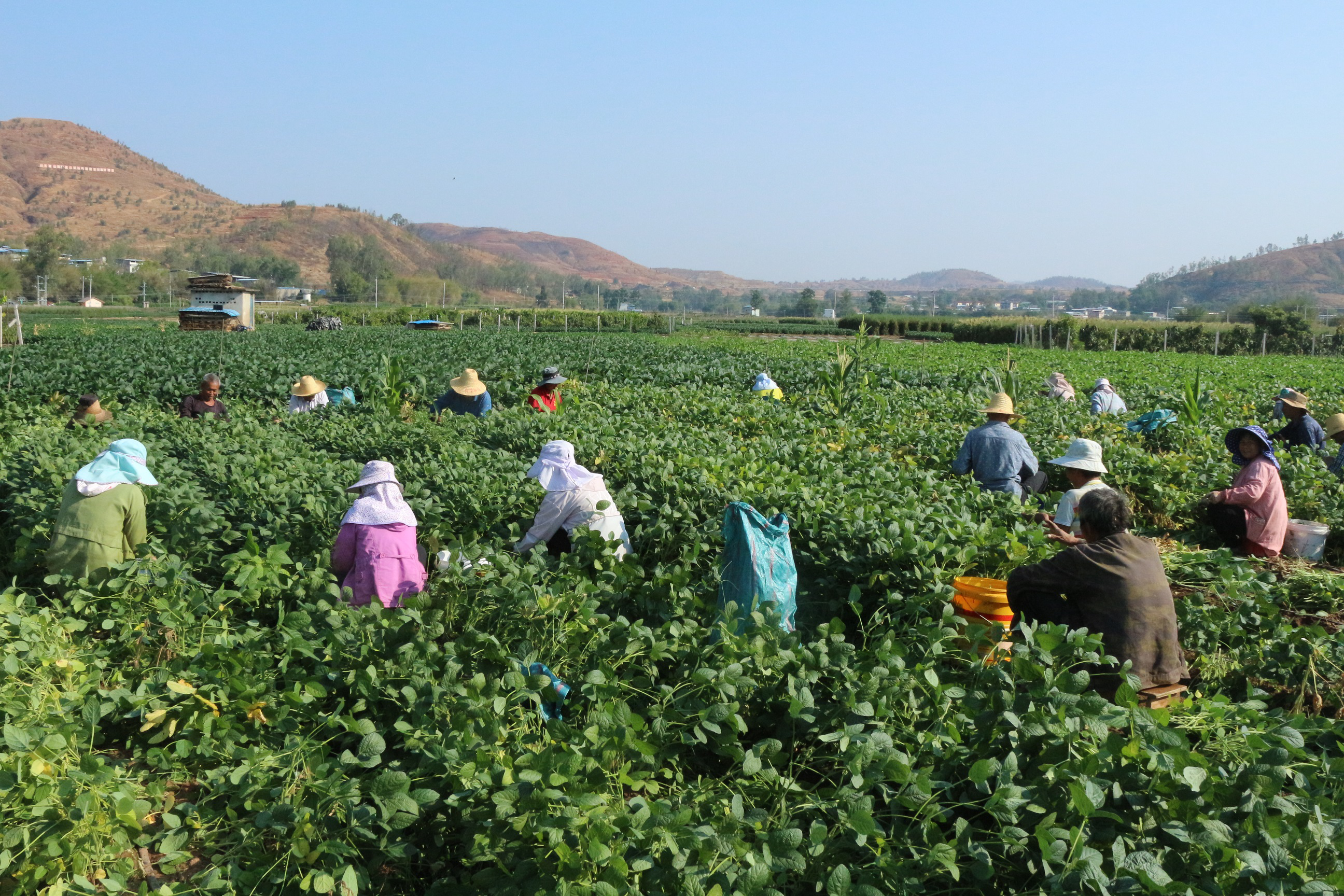 走进华竹帕地村,成片青毛豆映入眼帘,土地平旷,阡陌纵横,郁郁葱葱,青翠欲滴,豆地里随处可见村民采摘毛豆的忙碌身影。“我们每天早上5点就起来摘豆子了,10点左右要拿去村口的货场过秤、装车,今年毛豆收成不错,亩产近1000公斤,亩净收益5000元左右。”村民彭德云看着饱满的青毛豆乐呵呵地说道。