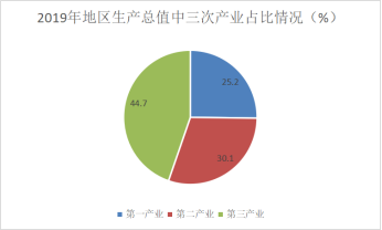 第一、二、三产业增加值占生产总值的比重为25.2:30.1:44.7,按常住人口计算的人均GDP为38129元,按目前汇率(1美元=7.0610人民币)折算折合5400美元。非公有制经济增加值419707万元,占GDP的比重为49.7%,按可比价计算比上年同期增长12.2%。