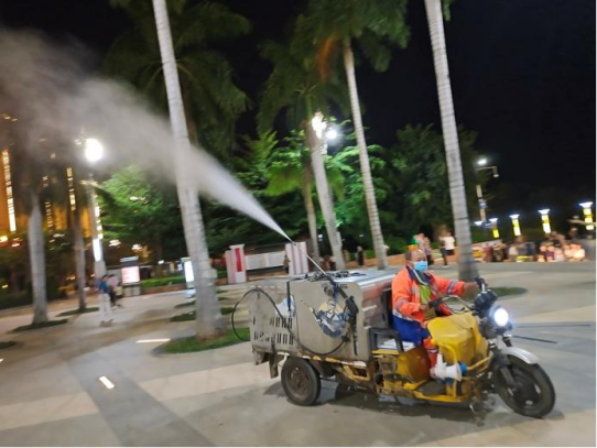 8月25晚9时,元谋县城大街小巷响起了洒水车的音乐声,打破了安静的夜晚。雾炮车 “喷云吐雾”,对城区主次干道、公园、广场等公共区域进行循环喷洒,无死角、无盲区“进行全城大消毒”。