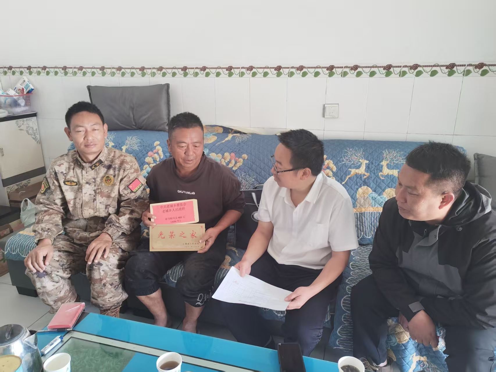 在慰问新入伍士兵家属、获评“四有”优秀军人的现役士兵家属中,慰问组为符合条件的家庭送上“光荣之家”牌匾,彰显了支持国防事业家庭的荣耀;针对“四有”军人家属,慰问组送上喜报与慰问金感谢信,感谢他们为国家和军队培养出优秀人才,并分享士兵在部队立功受奖的事迹,让军属们深切感受到这份荣誉的分量。同时,认真倾听军属们的诉求与期盼,逐一登记,以便后续做好帮扶;叮嘱他们要保重身体,继续支持好国防建设和家乡各项建设事业。