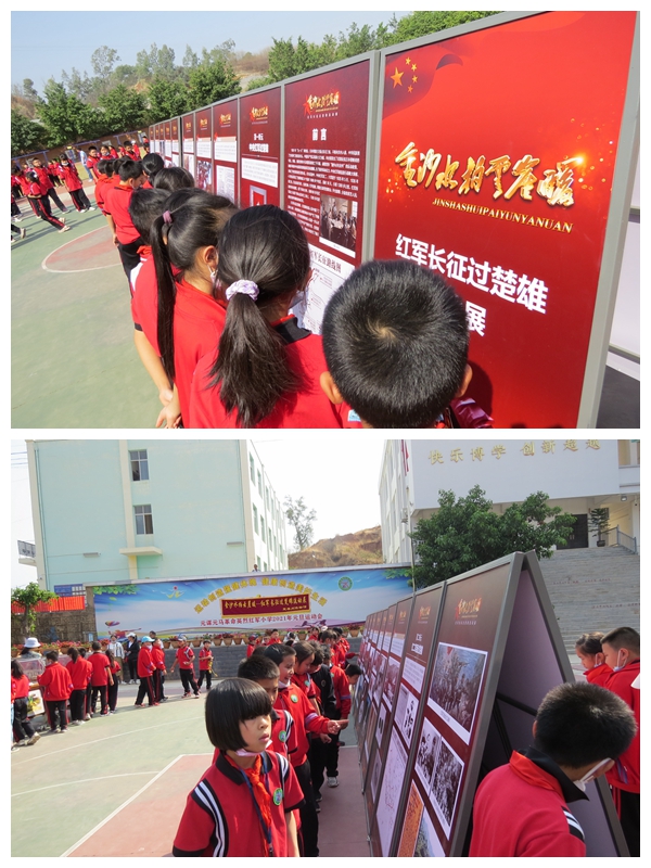 元谋元马革命英烈红军小学26个班1300多师生,在德育室主任王杰老师的精心组织下按照低、中、高段排队有序入场参观“沙水拍云崖暖—红军长征过楚雄”流动展览。