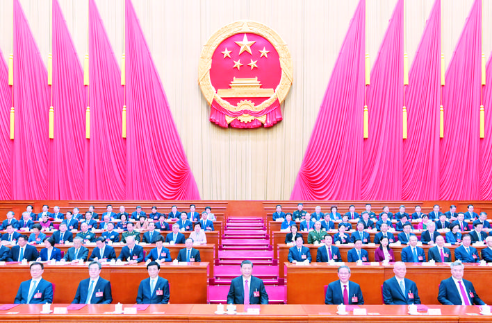 3月11日,第十四届全国人民代表大会第二次会议在北京人民大会堂举行闭幕会。大会主席团常务主席、执行主席赵乐际主持闭幕会并讲话。(新华社记者 李学仁 摄)