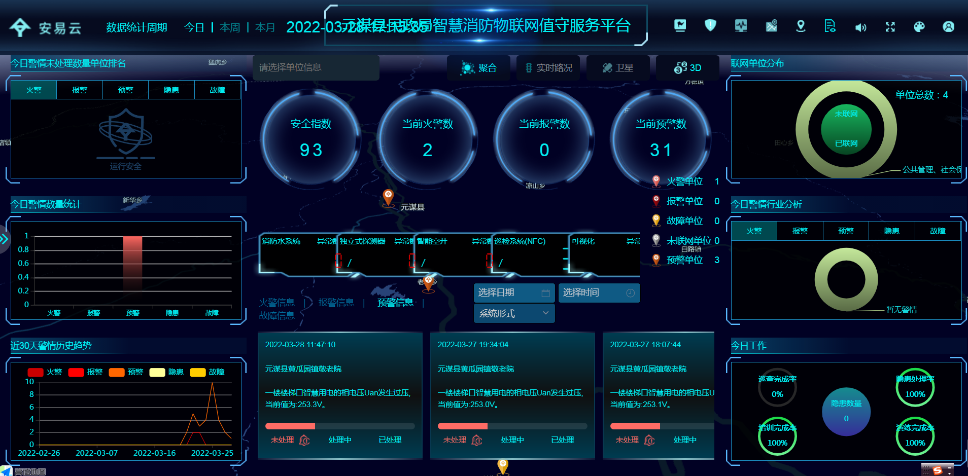 2022年以来,元谋县民政局在元马镇敬老院、黄瓜园镇敬老院、老城乡敬老院、羊街镇敬老院4个公办养老机构积极推进公办养老机构智慧消防项目。依托互联网+安全,线上建立消防监控平台,线下建立应急队伍。形成线上线下相互配合,实时互动的立体式消防安全管理新模式,实现养老机构消防安全系统化、智慧化,有力提升养老机构消防安全应急处置能力,为在院老人提供了立体式安全保障。