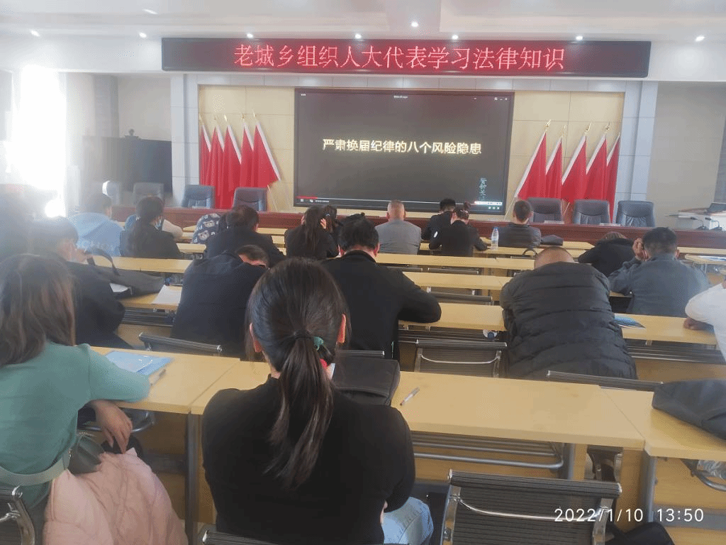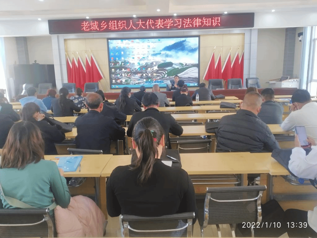 2022年1月9日至1月11日,老城乡召开第十二届人民代表大会第一次会议。为进一步提高县乡人大代表依法履职能力和履职水平,提高县乡人大代表的法律素养,老城乡在召开会议期间,认真组织人大代表、列席人员共98人学习法律知识。