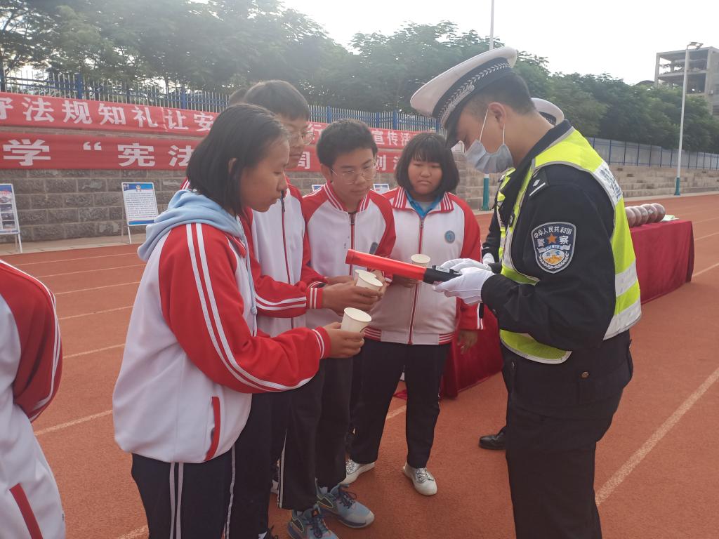12月3日,永武高速路交巡警大队一行7人亲临元马中学,通过学生亲自体验、现场问答、交通常识抢答等一系列活宣传交通安全知识。在活动现场,交警同志用不同浓度的酒精让学生亲自用检测仪检测,向师生普及了什么浓度的酒精可以达到酒驾,什么叫醉驾。此外,交巡警大队的同志还准备了一些学生们的学习用具和体育用品作为小礼品给送给参与互动答题的同学,提高了现场学生参与答题的积极性,更加有效的普及了交通安全知识。