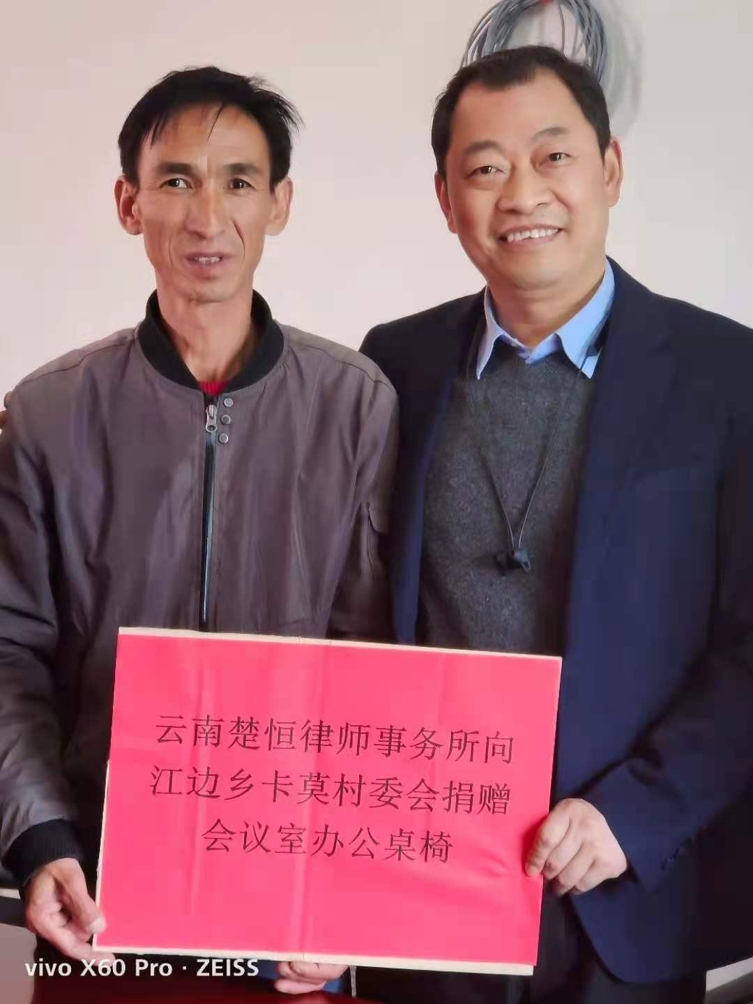 2021年12月4日州司法局公共法律服务管理科科长肖仁睿、云南楚恒律师事务所主任(楚雄州律师协会副会长)郑志军和元谋县司法局党组书记、局长文显富一行深入到元谋县江边乡卡莫村委会开展公共法律服务惠民行动,并向村委会捐赠了价值1万余元的会议室桌椅。