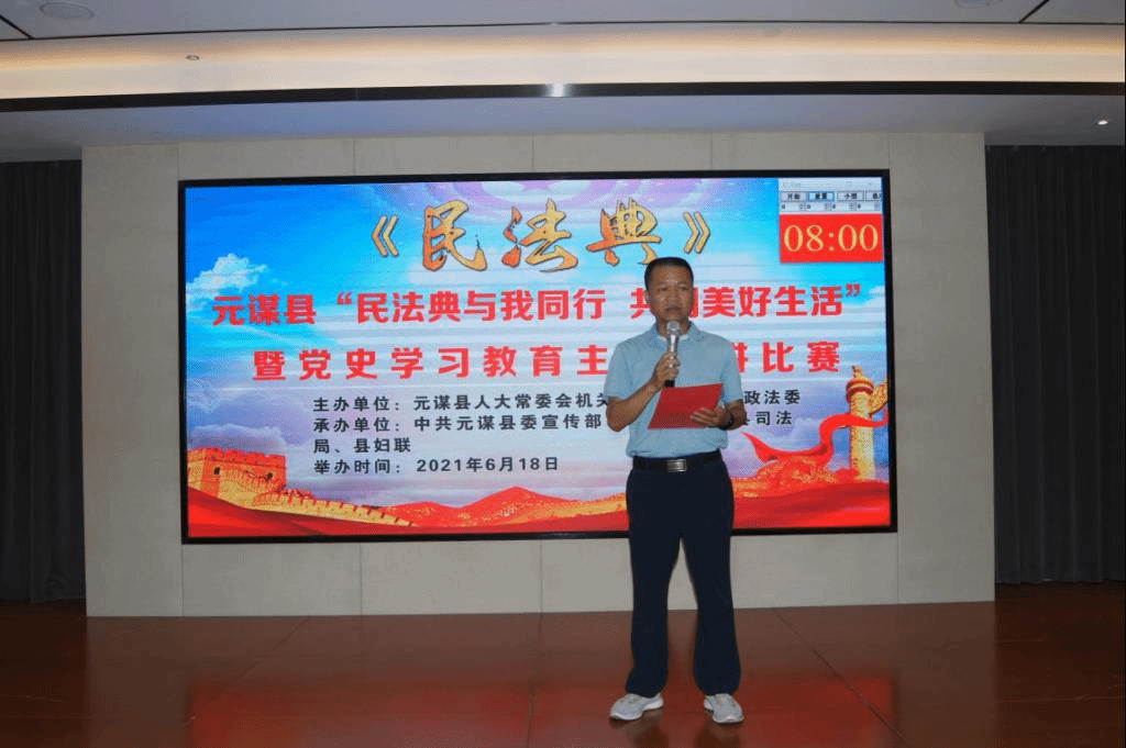 为普及民法典知识,弘扬民法典精神,维护民法典权威,切实做好民法典的学习宣传和贯彻实施工作,更好地推进全面依法治国、建设社会主义法治国家,更好地保障人民权益,2021年6月18日,中共元谋县委政法委、县总工会、县司法局在泷湖酒店小礼堂共同举办了元谋县2021年“民法典与我同行共创文明美好生活”演讲比赛。总工会主席郑武亲临比赛现场并作了致辞,全县各基层工会共120多名职工群众参加观看演讲比赛。