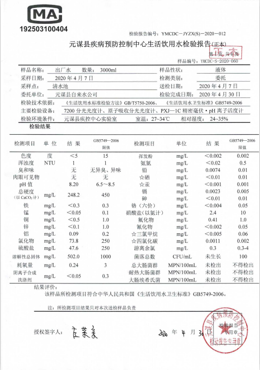 为响应广大人民群众要求,让群众喝上放心水、明白水,并接受社会监督,现将我公司委托元谋县疾病预防控制中心监测检验的2020年4月自来水供水水质检测结果公告如下: