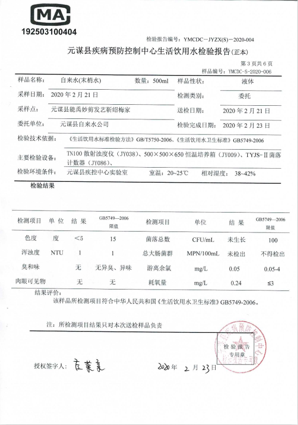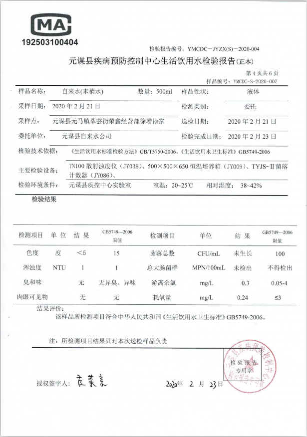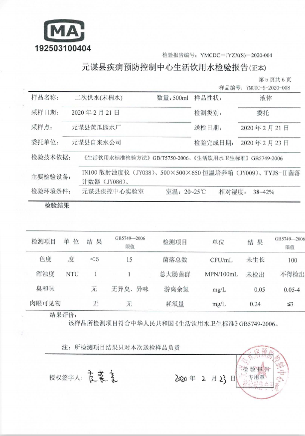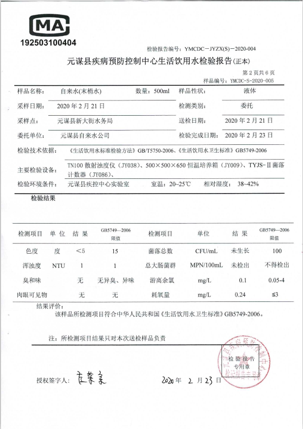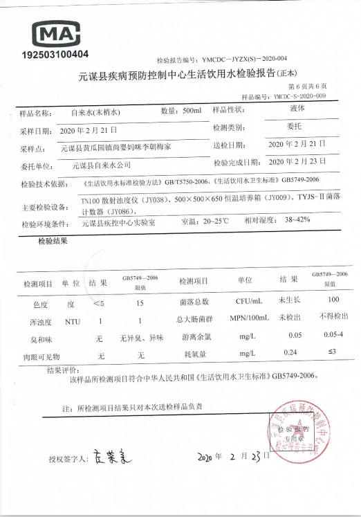 为响应广大人民群众要求,让群众喝上放心水、明白水,并接受社会监督,现将我公司委托元谋县疾病预防控制中心监测检验的2020年2月自来水供水水质检测结果公告如下: