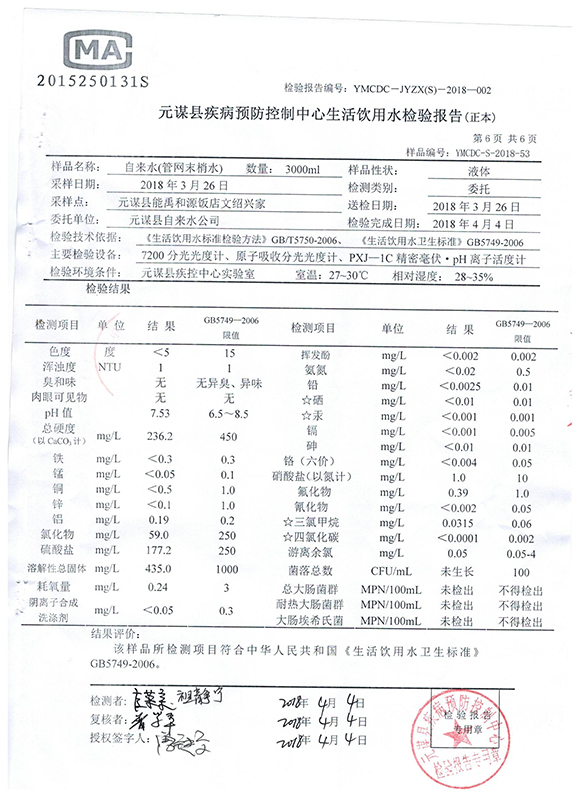 疾病预防控制中心分别对元谋县黄瓜园水厂、元谋县黄瓜园星缘饭店、元谋县新大街志鸿餐厅、元谋县沙地李丙祥家、能禹和源饭店文绍兴家六地的自来水水进行了抽检。经检测,以上五组水样的色度、菌落总数、浑浊度、总大肠菌群、耐热大肠菌群、大肠埃希氏菌、臭和味、游离余氯、肉眼可见物、PH值、总硬度、铁、锰、铜、锌、铝、氯化物、硫酸盐、溶解性总固体、耗氧量、阴离子合成洗涤剂、挥发酚、氨氮、铅、硒、汞、镉、砷、铬、硝酸盐、氟化物、氰化物。三氯甲烷、四氯化碳、等34项常规检测指标均控制在国家规定安全限值范围内。所测水样水质符合GB5749-2006国家生活饮用水卫生标准。
