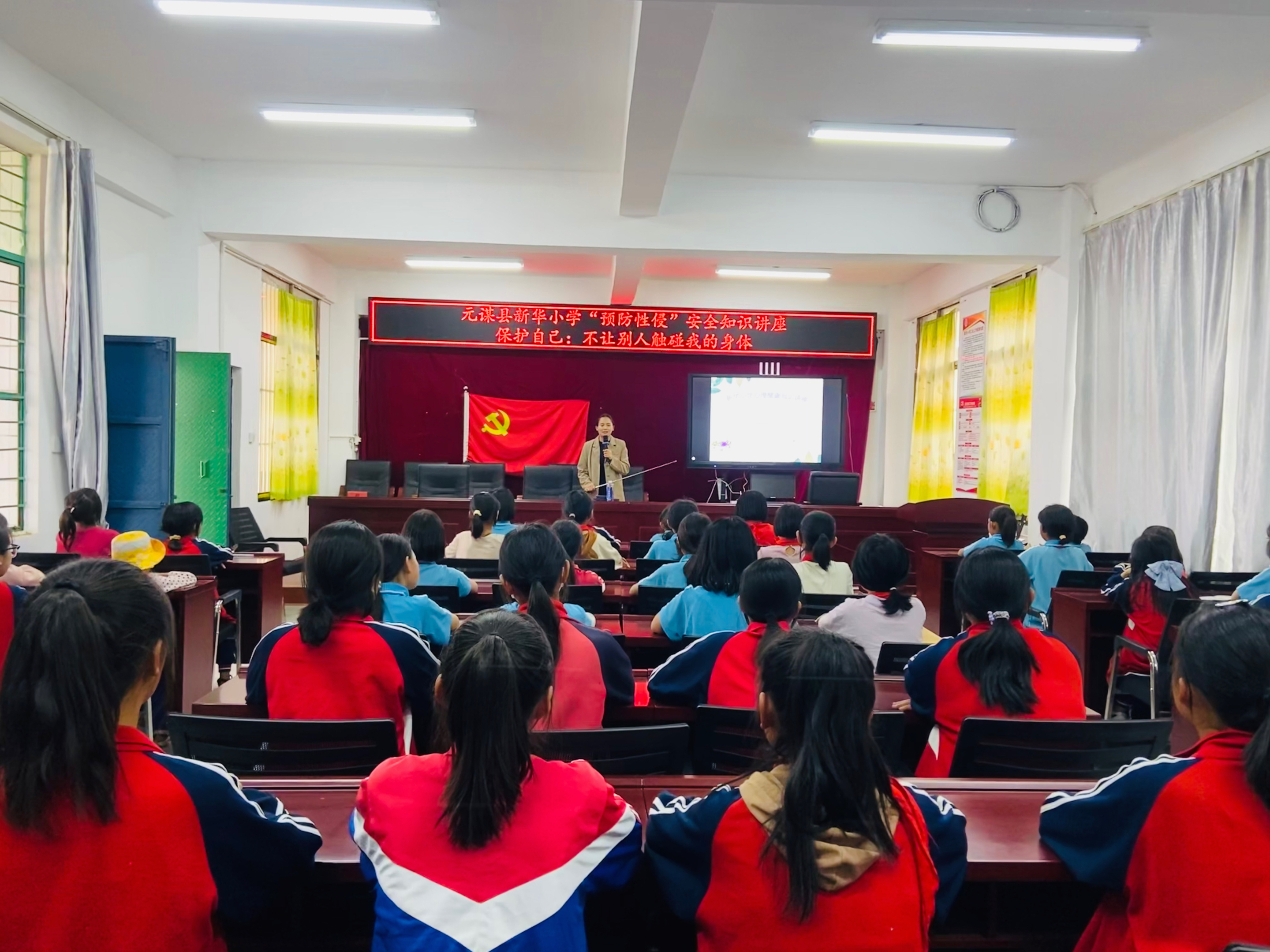 在新华中心完小,少先队总辅导员董老师向女生开展宣讲,男生由李老师宣讲,两位老师通过让学生观看了预防性侵安全教育短片,建立了“隐私”的概念,认识了解了自己的身体,学会了如何保护自己和尊重别人的隐私部位等。同时通过观看PPT,数据统计、案例分析,交流互动的方法让学生懂得如何保护自己,知道了防范和应对性侵害行为的主要措施和方法。