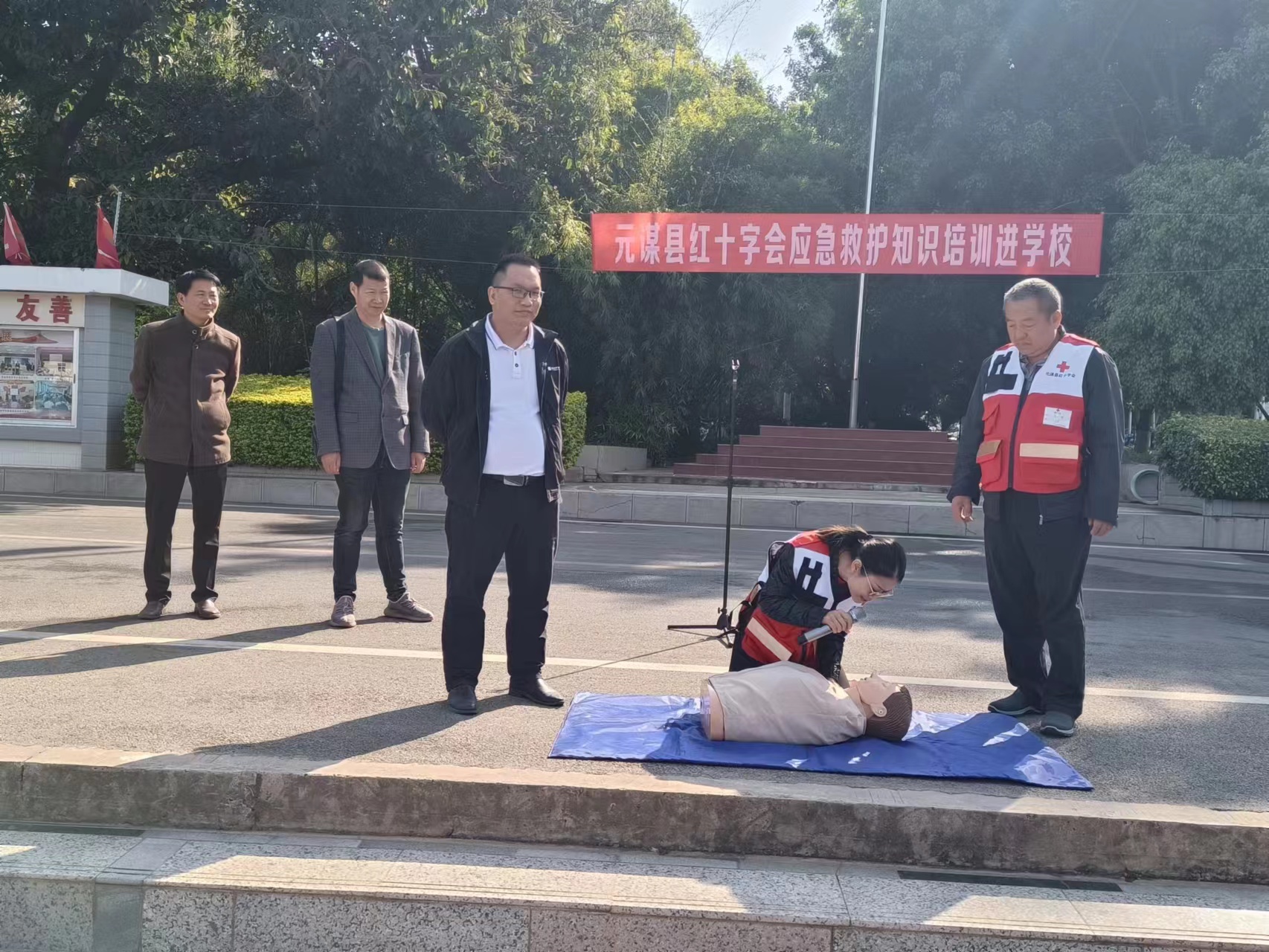 此次活动得到了县红十字会的大力支持,在完成疏散后,县红十字会对全校师生开展了应急救护知识培训,培训采取理论与实践相结合,通过讲解心肺复苏基本原理,进行心肺复苏进行了实操演练,大幅提升了培训实效,此次活动取得圆满成功。