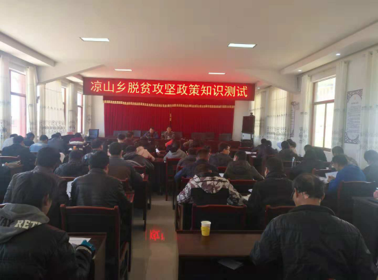 为认真落实“一日一学,一周一考”制度,达到以考促学提升干部职工脱贫攻坚政策水平的目的,凉山乡组织全乡干部职工、村三职干部、驻村工作队员开展脱贫攻坚政策测试。测试方式采取集中闭卷测试,测试内容紧贴当前我乡干部职工、村三职干部、驻村工作队员进村入户开展脱贫攻坚工作需要,确保考题质量过硬,符合我乡当前实际乡情,考试过程安排有监考人员,确保考试不流于形式,真正发挥脱贫攻坚政策测试的作用。