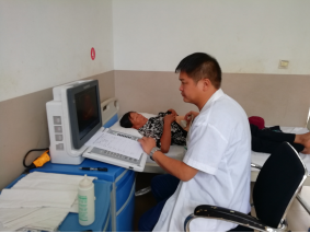 图3(右) 元马镇卫生院院长付亚兵同志为群众做腹部B超检查