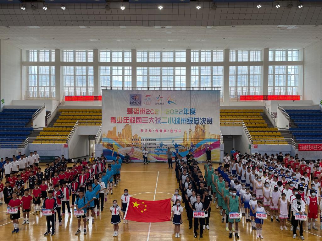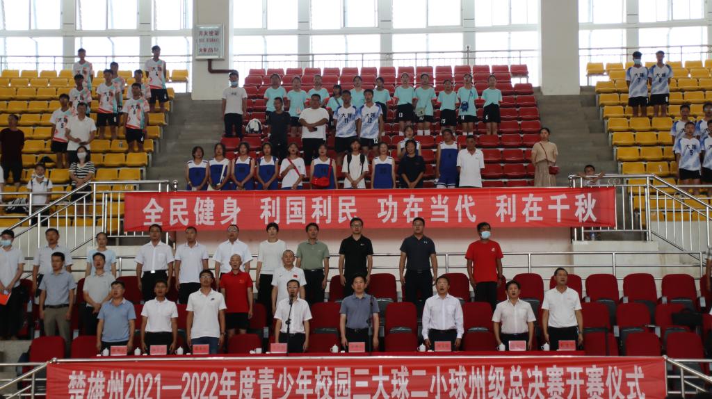 开幕式上,楚雄州人民政府副州长王秀江致开赛辞,并宣布楚雄州2021—2022年度青少年校园三大球二小球州级总决赛篮球足球排球比赛开赛。