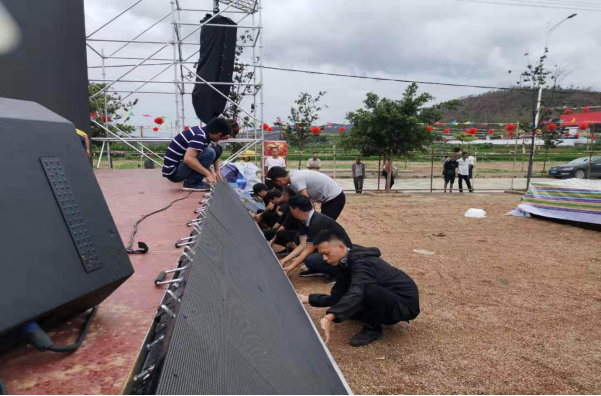 元谋县文化和旅游局相关工作人员正在做开幕式文艺演出的舞台搭建以及音响、屏幕安装和调适等准备工作。