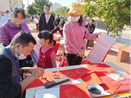 妙笔生花送祝福,挥毫泼墨迎新春。无联不成春,有联春更浓!“过大年,写春联”是中华民族的传统习俗。在观看节目的同时,由县文联组织县书法协会7名书法老师到江边乡红色文化广场开展“欢乐迎新春,免费送春联”文化惠民活动,为村民献上了一份文化味儿十足的“年货礼包”。活动现场,长桌铺开,笔墨铺就,老师们凝神聚气,提起毛笔,沾上墨汁,挥毫泼墨。“挥春送祝福,墨香迎新春。我们只要能写字,比过年那天都开心”,书法老师姚绍芹不辞辛劳地说。现场一副副喜庆吉祥的春联、一句句美好的新年祝福跃然纸上,一张纸饱含深情的“福”字,隽秀的字体配上美好的祝福,表达了群众对美好生活的期待,营造了浓浓的新春氛围,让群众体验了笔尖上的年味。