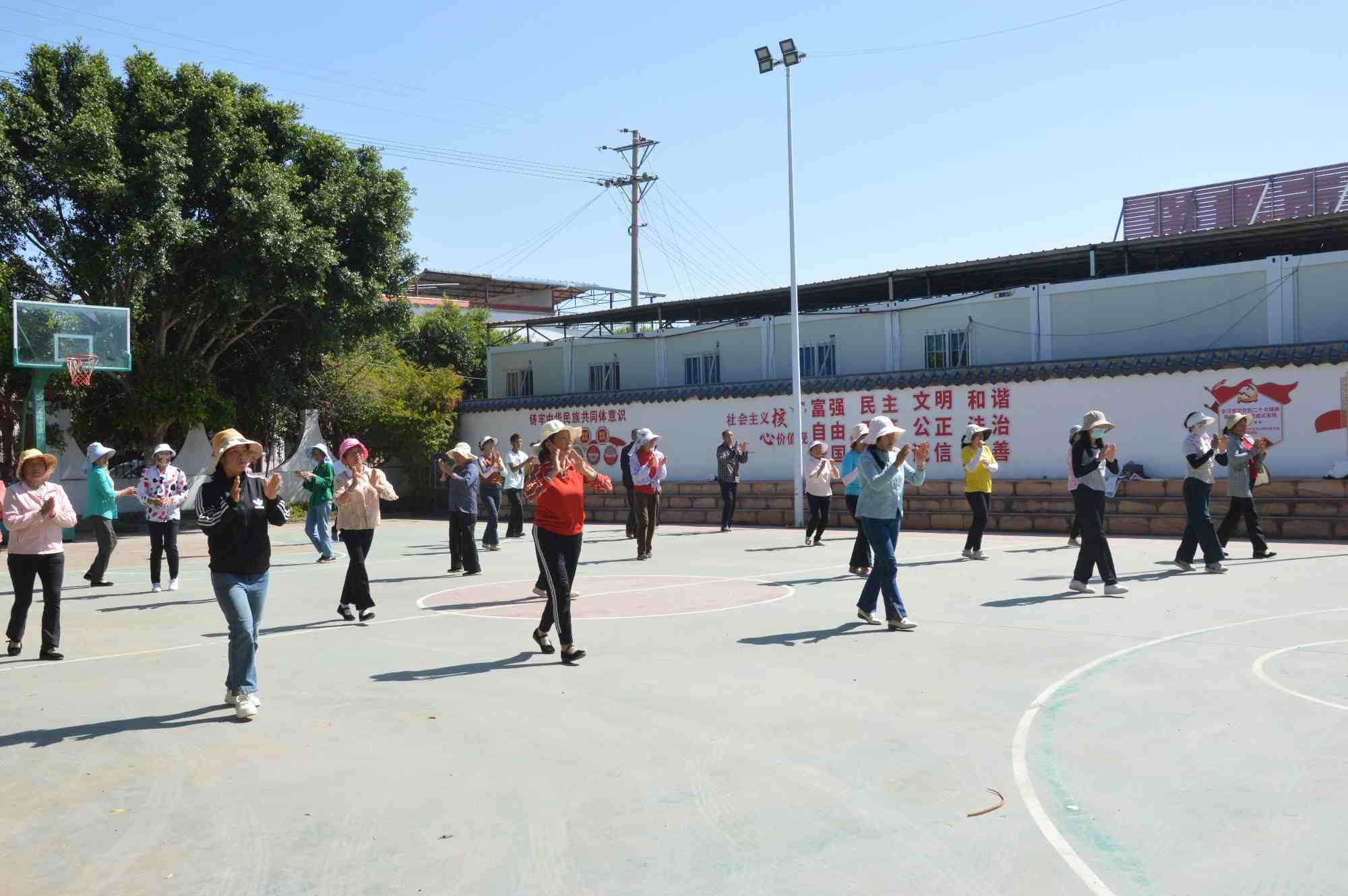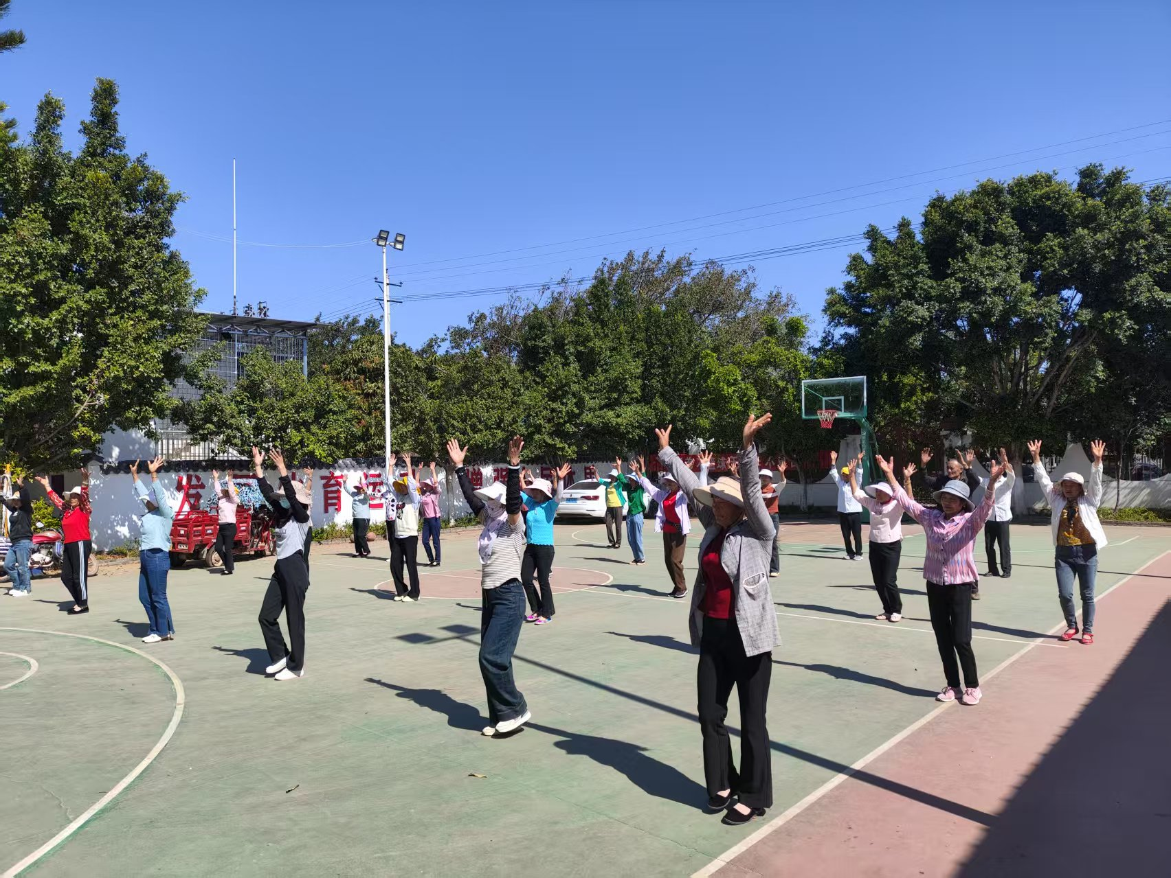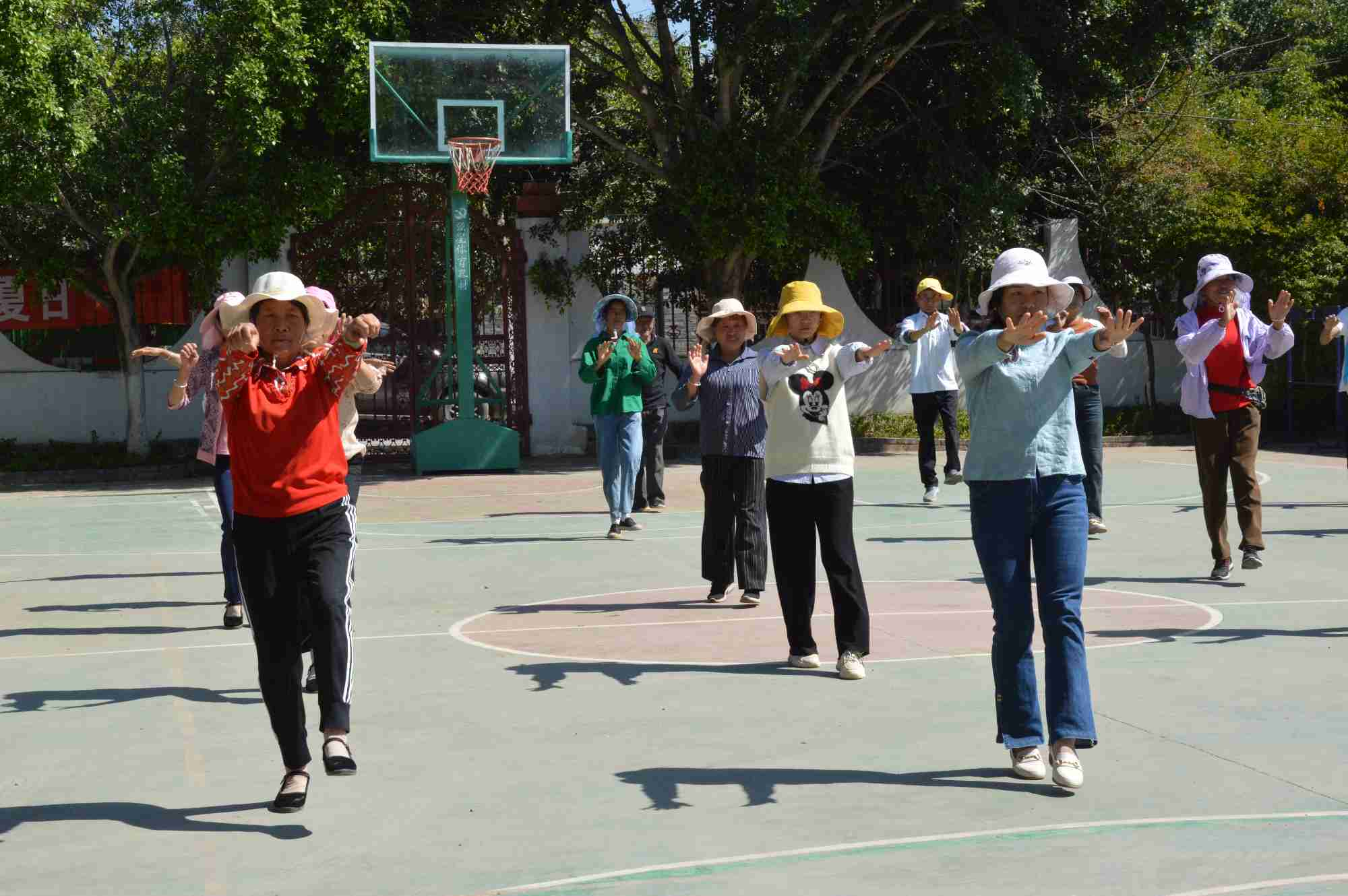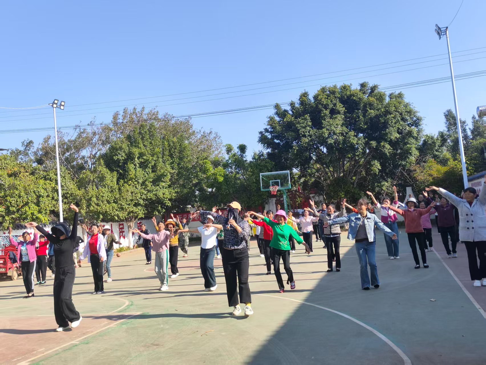 培训过程中,彝族广场舞的教学现场气氛热烈。结合新华乡彝族聚居的特色,舞蹈教师以独特的“民族元素 + 现代编排”思路进行教学。从彝族传统舞蹈最基础的踏步、跺脚等动作教起,细致讲解每个动作的要领和背后蕴含的文化内涵。为了让学员们更好地掌握,老师采用慢动作示范,把每个动作拆解展示,随后组织学员分组演练。学员们两两一组,互相纠正动作,交流心得。不仅如此,为了让学员提前适应演出场景,还专门安排在乡篮球场进行沉浸式排练。模拟村级演出时的灯光、舞台布局,大家全情投入,力求将最好的状态和舞姿展现出来。