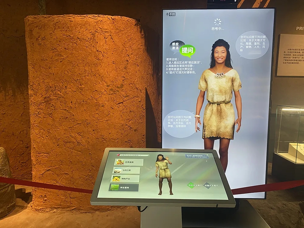 内容上突破过去百度百科式的科普展示形式,更注重学术研究成果、珍贵的考古资料图片及元谋代表性文化的重点展示。形式上大量通过矩阵式、仓储式的展柜陈列及艺术情景再现的方式进行文物展示,展示效果突出,记忆点强烈。技术上通过元谋人牙齿的透明屏展柜及创新打造的大墩子文化AI数字人“元元”,力求文物活起来,给观众带来全新的参观体验。