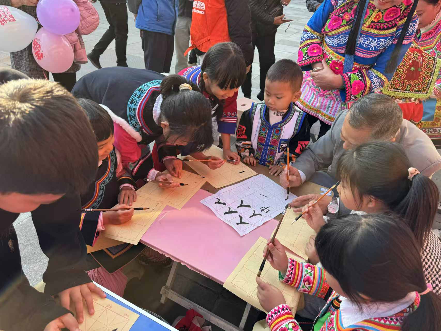 写春联、写福字区域同样热闹非凡。凉山乡退休老同志思建忠现场教学,耐心指导小朋友们挥毫泼墨。小朋友们认真书写,一幅幅充满童趣的春联和福字跃然纸上。活动现场还为大家赠送了春节福字,传递新春祝福。