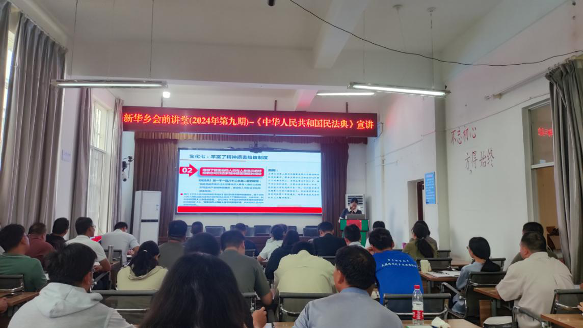 在活动中,新华司法所的工作人员开展了法治宣传教育讲座,重点宣讲了民法典的立法历程、作用、构成以及新的变化和亮点。通过鲜活的典型案例,将民法典中涉及婚姻家庭、继承、物权等群众普遍关心的热点、难点问题进行了集中讲解,增强了广大农村基层群众对民法典的尊崇和认同。
