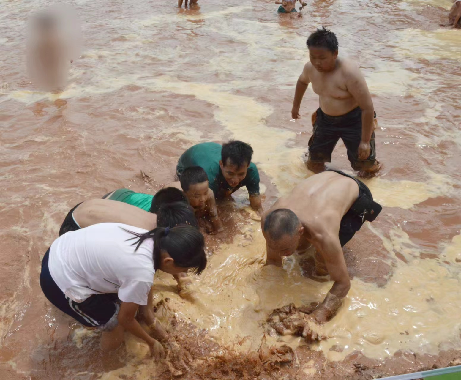 下午两点,现场已是人山人海,水中群鱼欢腾,岸上喝彩阵阵,热闹无比。随着一阵锣声,“浑水摸鱼”活动正式开始。村民和游客纷纷卷起袖子、挽起裤腿,化身为“摸鱼达人”,涌入水塘、徒手摸鱼,大家各自使出浑身解数与鱼“斗智斗勇”,有的驻足观察鱼情,等待良机,有的四处游走,迅猛发力精准捕捉。选手们任凭衣服浸透泥水,任凭泥泞满头满脸,到处都是嬉笑一片。