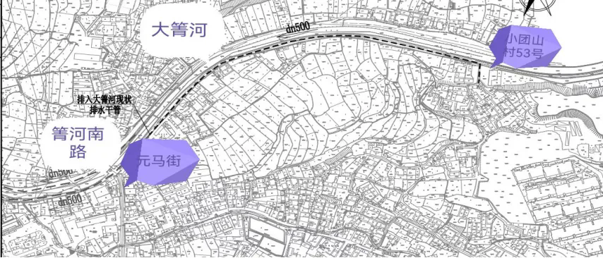 箐河南路与元马街交叉口-小团山村53号段排水管网系统改造施工位置及范围: