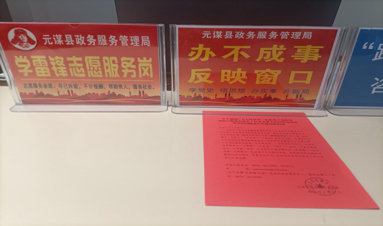 近日,走进元谋县人民政府政务服务中心,您就会看到在各服务窗口、大厅醒目位置张贴和摆放着“邀请广大人民群众一起监督干部作风 对窗口服务态度差工作效率低不回应群众诉求等突出问题可进行举报反映”的邀请函。