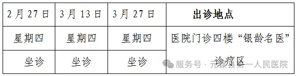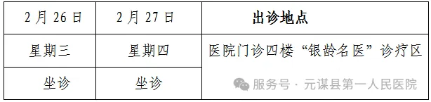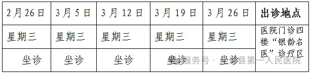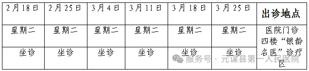 自本周起,08:00-11:30,14:30-17:30,五位“银龄名医”均在固定时间出诊(国家法定节假日除外),出诊时间及出诊地点详见“银龄医师”专家出诊信息表。