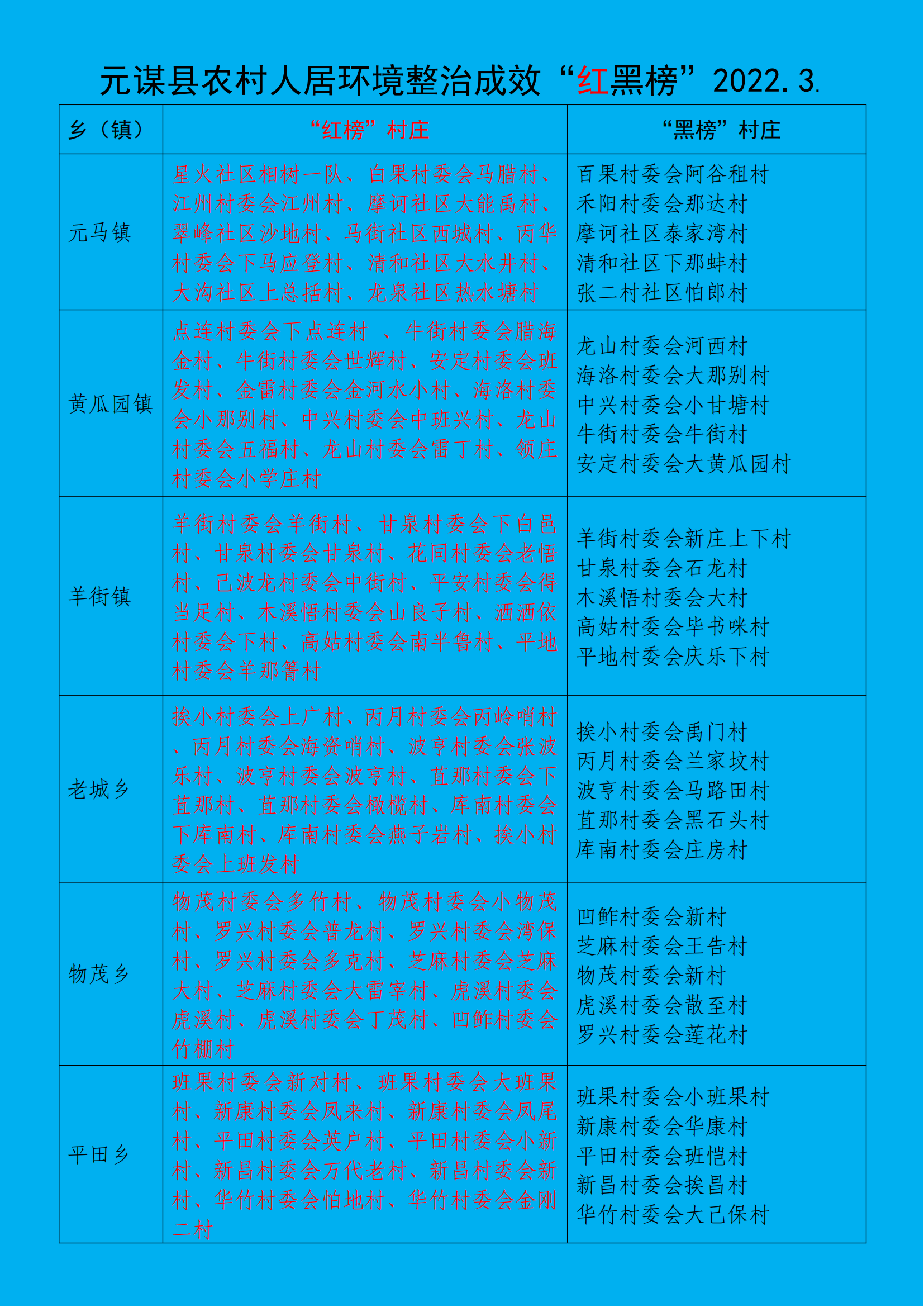 为深入贯彻落实党中央、国务院关于农村人居环境整治的决策部署,以正面激励与反面警示相结合的方式,宣传表彰先进、鞭策督促后进,进一步激发群众参与环境整治的内生动力,持续巩固提升整治成效,改变农民群众不良生活习惯,形成积极向上的新风尚,提高农民群众的获得感、幸福感。元谋县立足农村人居环境一档村庄八条标准,建立了农村人居环境整治成效“红黑榜”制度,对全县所有自然村进行评定打分,定期进行发布。农村人居环境整治工作做得好的村庄进入“红榜”,做得差的村庄列入“黑榜”,并对红榜村适时进行通报表彰,对黑榜村及时进行督促整改。以下是2022年3月入榜村庄,赶紧瞧瞧你家上什么榜!
