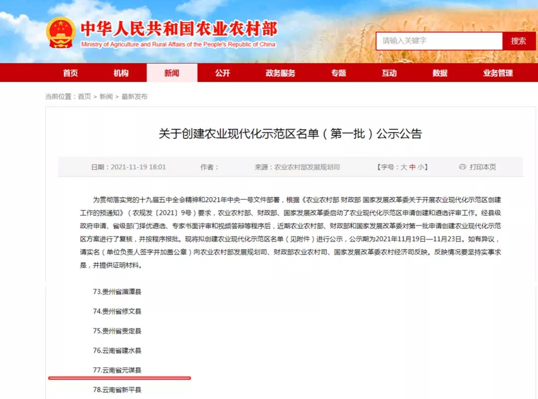 农业农村部、财政部、国家发展改革委公布了全国第一批创建农业现代化示范区名单,云南省元谋县成功入选。